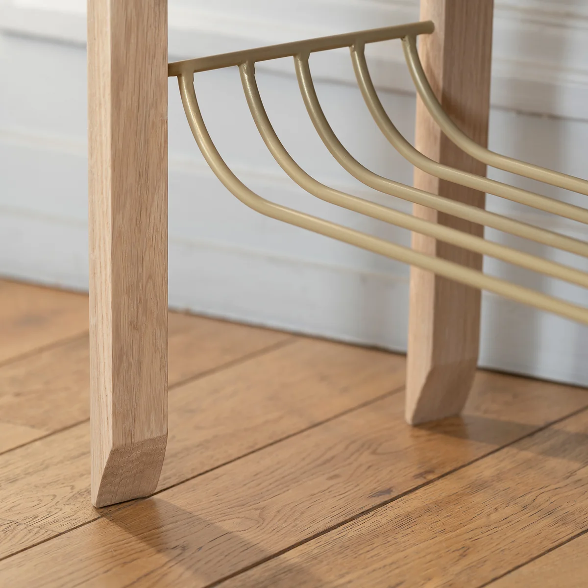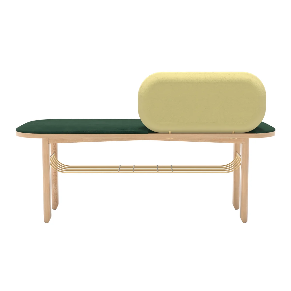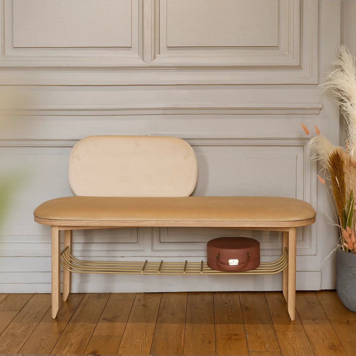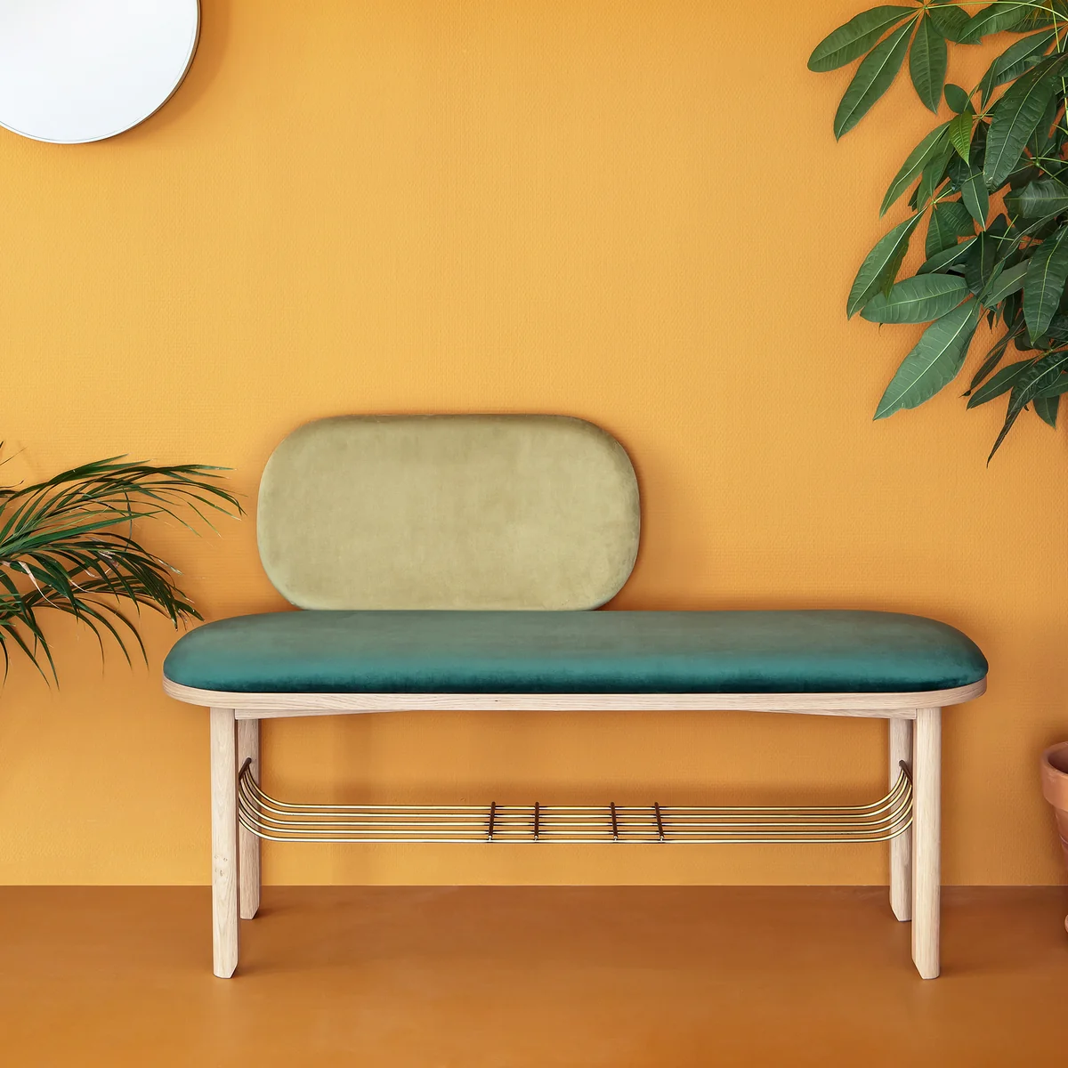 Gefertigt in Portugal, besteht die Eustache Bank aus einer stabilen Massivholzstruktur mit Schaumstoffpolsterung und Samtbezug, ergänzt durch einen Korb aus messingfarben lackiertem Metall.