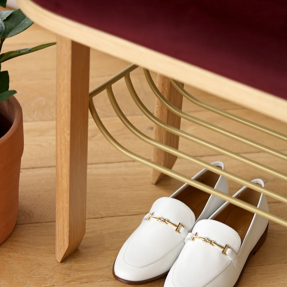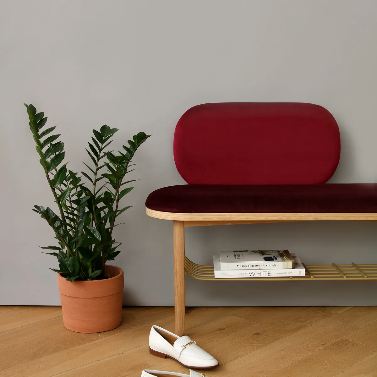 Die Eustache Bank vereint Eleganz und Funktionalität mit ihrem Boudoir-Samt, sorgfältigen Details und einem metallenen Korb in Messingoptik. Sie ist ideal für den Eingangsbereich oder das Schlafzimmer, perfekt zum Schuhe ausziehen, Jacken ablegen oder zur Aufbewahrung von Schuhen.