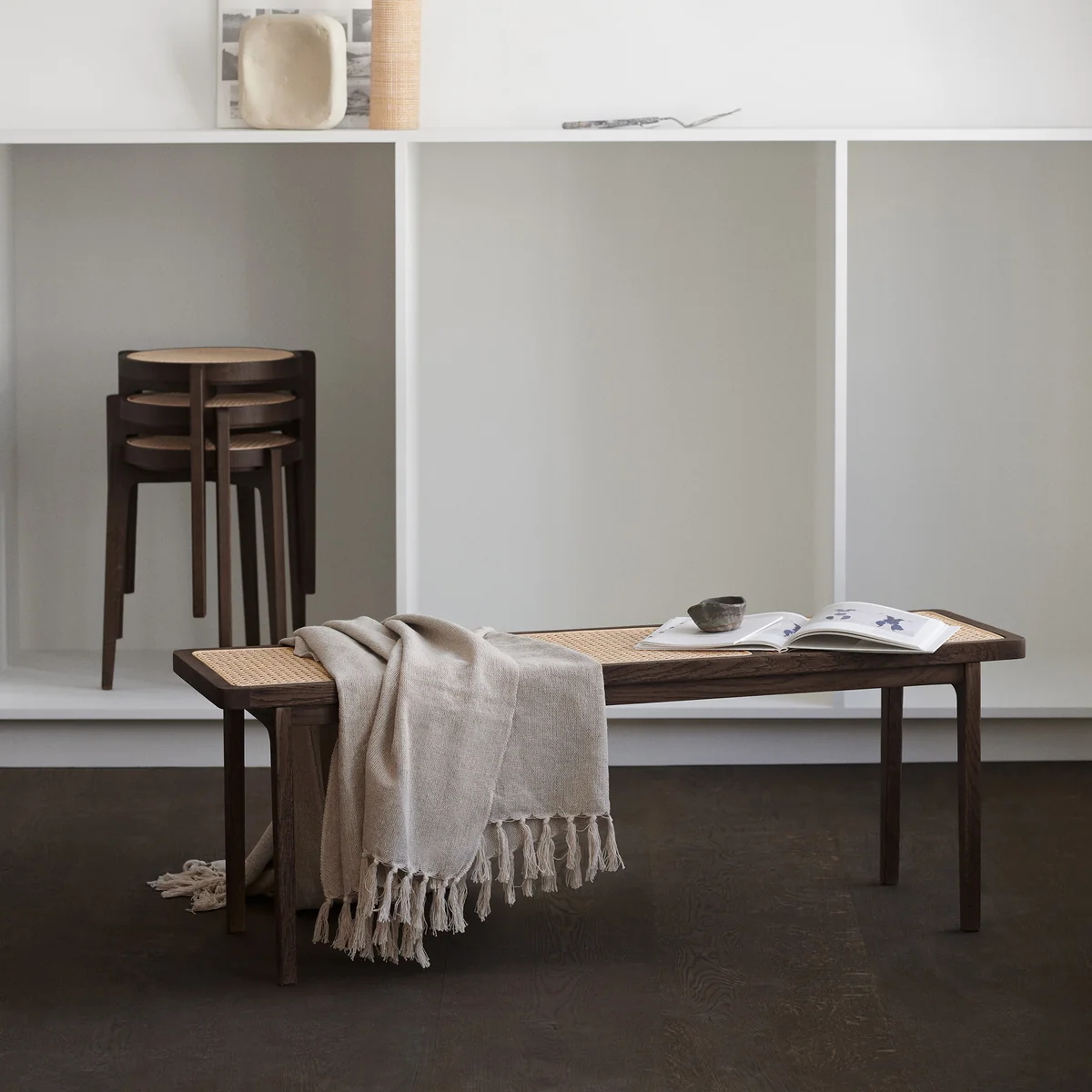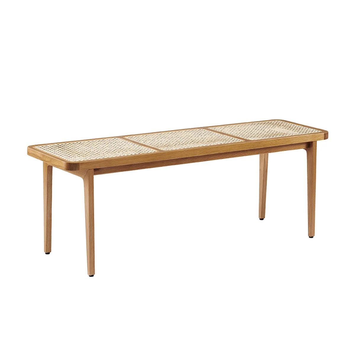 Die Bank besteht aus einem Gestell aus massivem Holz. Das Rattangeflecht wird in einem traditionellen Verfahren in den Rahmen eingesetzt. Das Geflecht verschmilzt auf schöne Weise mit seiner Umgebung und unterstreicht die einfache Konstruktion der Bank. Die Bank kann als Dekoration im Raum platziert werden und ist auch eine praktische Sitzgelegenheit im Eingangsbereich, am Esstisch oder im Schlafzimmer.