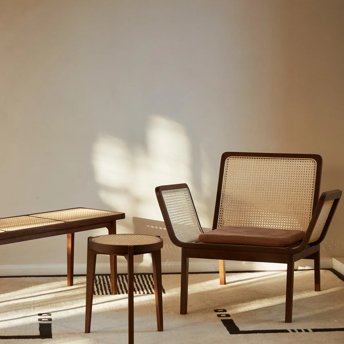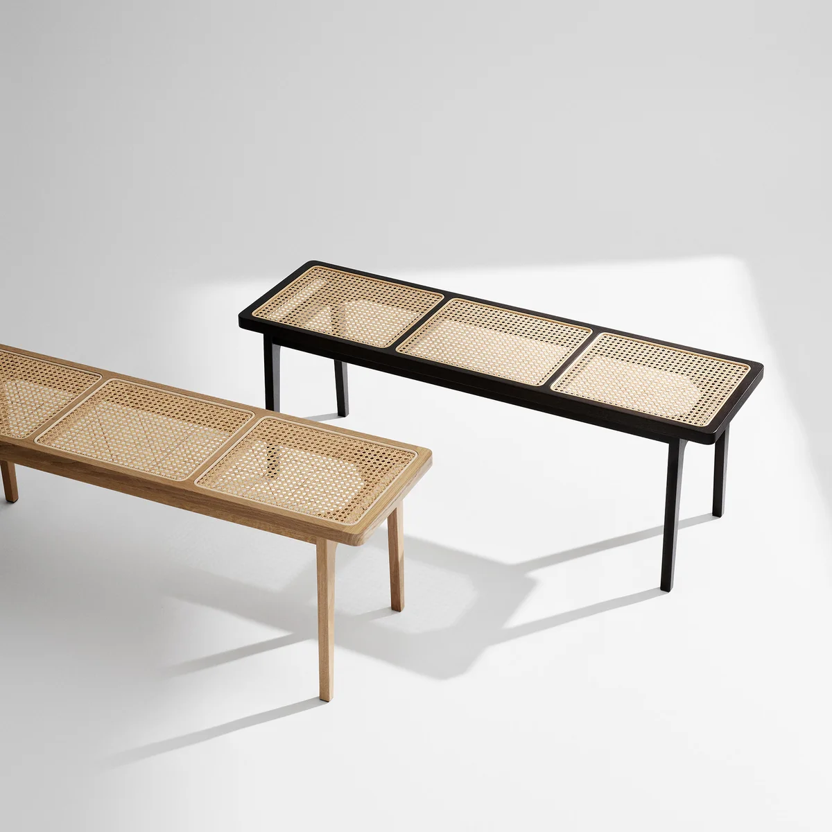 Die Le Roi von Norr11 ist eine Bank im klassischen Look, die von Kristian Sofus Hansen und Tommy Hyldahl entworfen wurde. Le Roi ist das französische Wort für König, und die Serie ist eine minimalistische Interpretation von Rattanmöbeln aus der französischen Kolonialzeit, die mit bekannten skandinavischen Möbelarchetypen wie dem dreibeinigen Rundtisch und der rechteckigen Bank verschmolzen sind.