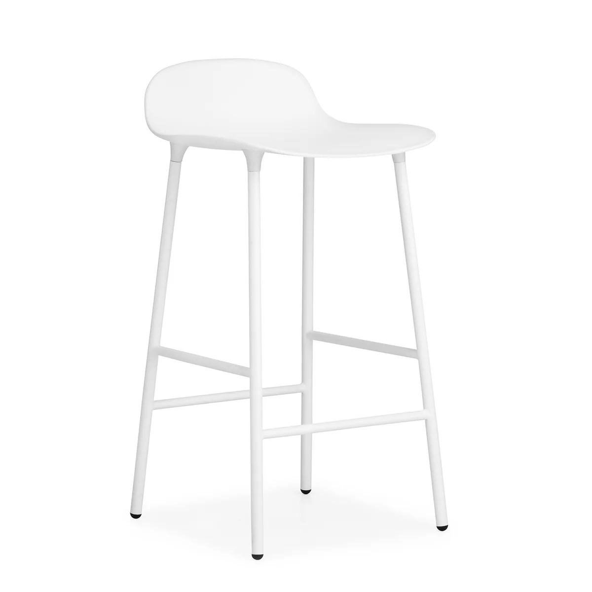 Simon Legald wollte mit der Form Serie von Normann Copenhagen Sitzgelegenheiten schaffen, die wie aus einem Guss erscheinen. Dieses Konzept geht besonders bei der Barhocker Version mit Stahlbeinen auf, bei der Sitzfläche und Gestell in derselben Farbe eine besondere Einheit bilden.