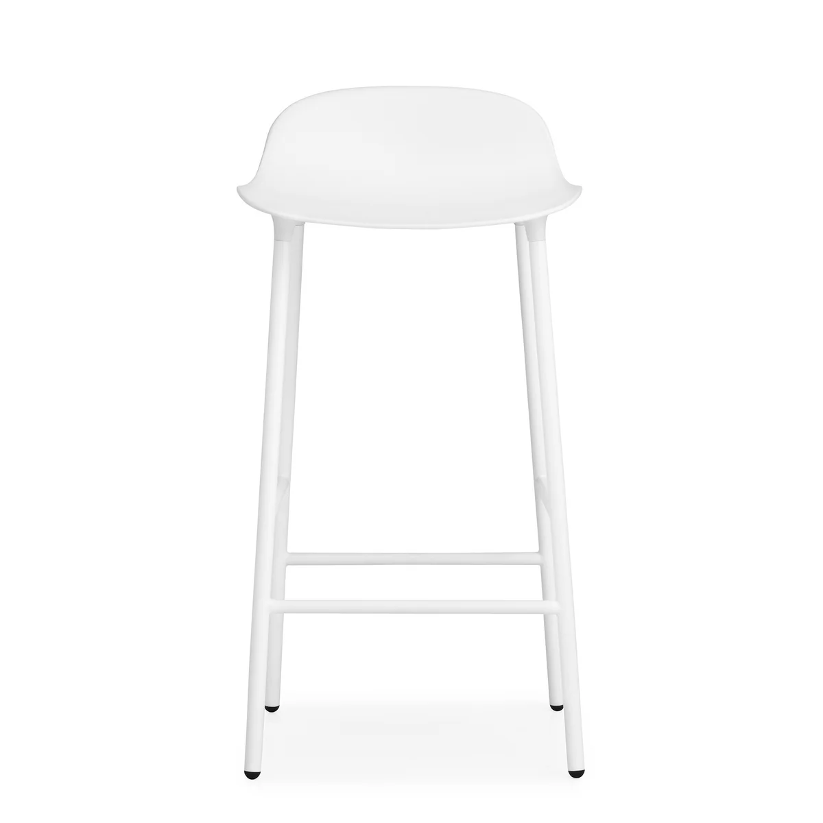 Zu der Form Serie gehören neben dem Barhocker (65 cm) mit Stahlgestell auch Hocker in weiteren Höhen, Stühle und Sessel mit Holz-, Stahl- und Chrom-Gestellen. Die passenden Tische gehören ebenfalls dazu.