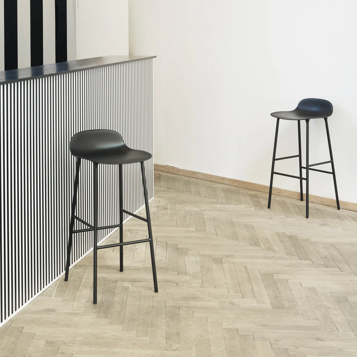 Der Form Barhocker besteht aus einem Stahlgestell und einer vorgeformten Sitzschale aus Polypropylen. Um einen nahtlosen Eindruck entstehen zu lassen, wird die Sitzfläche einfach auf den Rahmen gesteckt und so mit ihm verbunden. Unterstrichen wird diese innovative Lösung durch die einheitlichen Farben, die den Barhocker außerdem flexibel einsetzbar machen. Er passt sich dank der Farbvielfalt jedem Ambiente an und ist sowohl für den privaten als auch öffentlichen Raum geeignet.