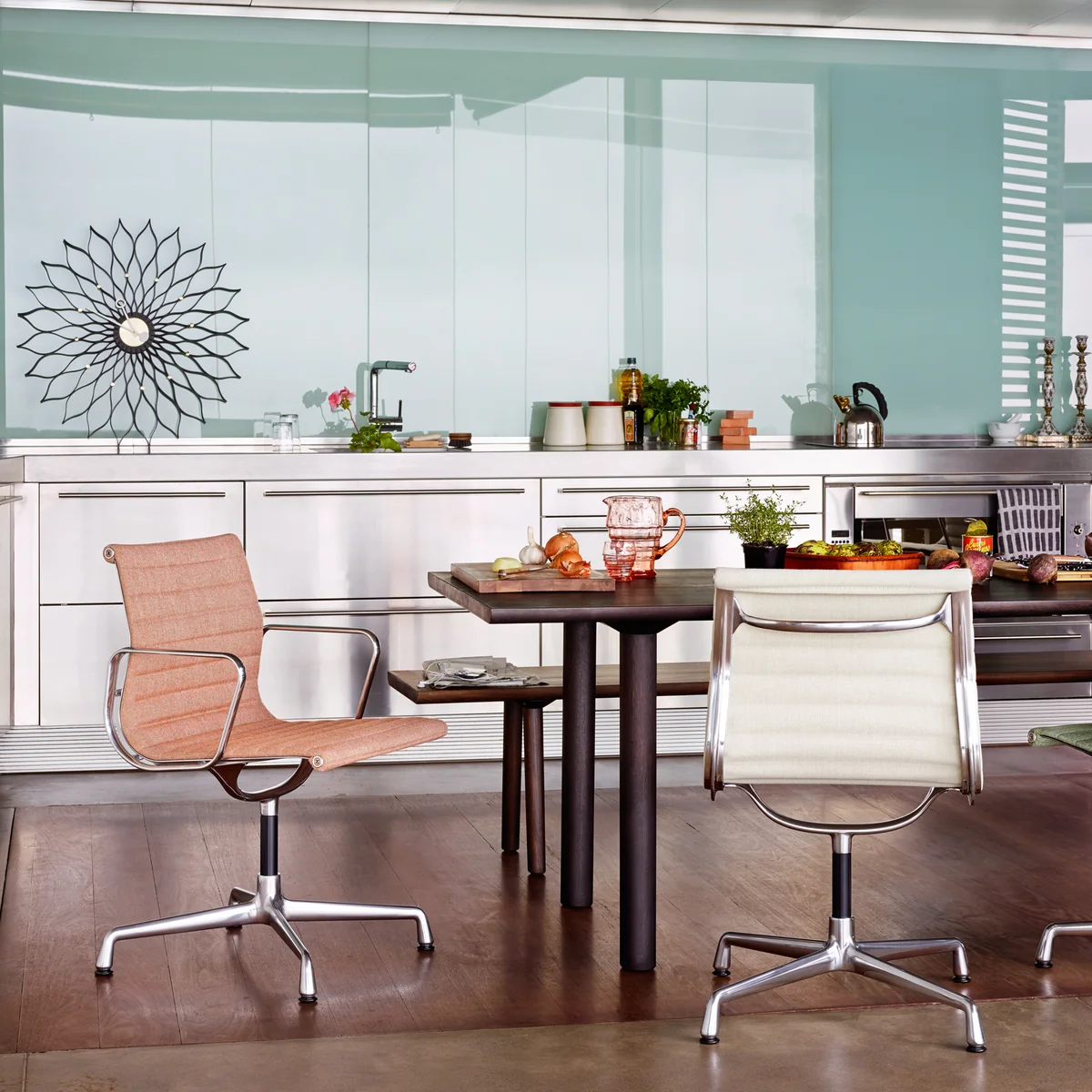 Mit diesen Eigenschaften eignet sich der EA 103 Bürostuhl gleichermaßen für Büros, öffentliche Räume und den Privatbereich. Der Aluminium Chair EA 103 eignet sich ideal für den Einsatz am Tisch: Er ist im Vergleich zu den anderen Aluminium Chairs schmaler, die Sitzposition ist aufrechter und etwas höher, die Armlehnen sind kürzer. Für das private Esszimmer, für Restaurants oder für Meetingbereiche im Büro ist der EA 103 optimal geeignet.