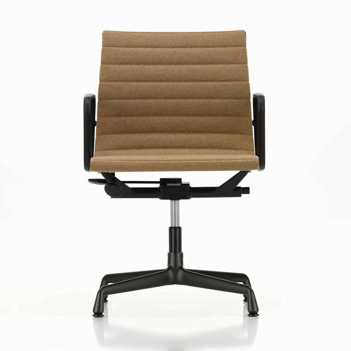 Der EA 132 Bürostuhl mit Armlehnen von Vitra zählt zu den herausragenden Möbelentwürfen des 20. Jahrhunderts. Vitra erweitert nun die Aluminium Chair und der Soft Pad Chair Stuhlfamilien um Modelle, die sich besonders für das Home Office eignen: Der Aluminium Chair EA 131, sein etwas schmalerer Pendant, der EA 132, sowie der Soft Pad Chair EA 231 sind mit einer verstellbaren Kippmechanik und einem aufrechten Sitzwinkel ausgestattet, der speziell auf die Anforderungen am Schreibtisch zugeschnitten ist. Ohne Rollen konzipiert, strahlen sie eine zurückhaltende und ruhige Eleganz aus.