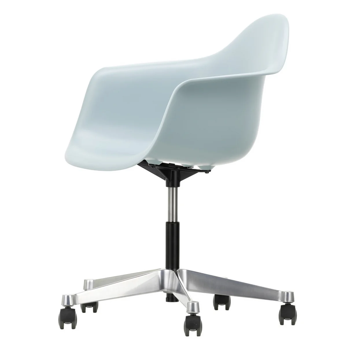 Der Armchair PACC ist eine Variante des Eames Plastic Chairs, der bereits 1948 von Charles und Ray Eames entworfen wurde und der erste industriell gefertigte Stuhl war. PACC (Pivot Armchair Cast Base on Castors) ist der Bürodrehstuhl der Serie.