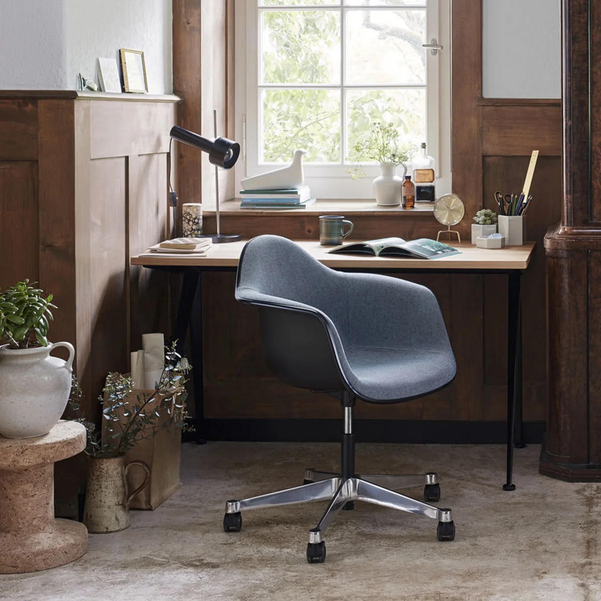 PACC macht mit seinem 5-Stern-Untergestell aus dem Plastic Armchair einen Bürodrehstuhl. Die organisch geformte Sitzschale des Plastic Armchairs wurde seit den 50er-Jahren mit unterschiedlichen Untergestellen kombiniert und millionenfach produziert. Aus Polypropylen gefertigt bieten die Armchairs heute einen nochmals verbesserten Sitzkomfort.