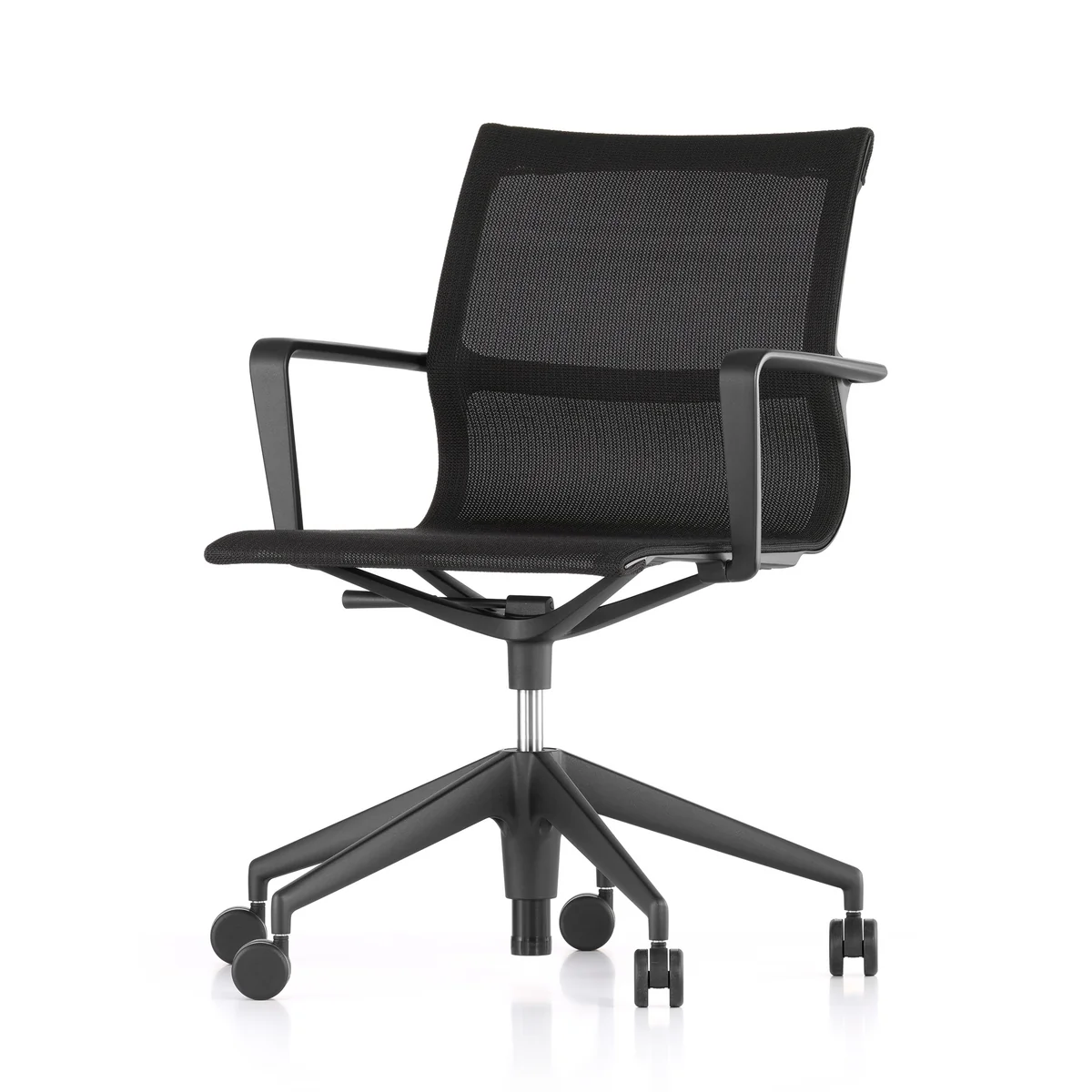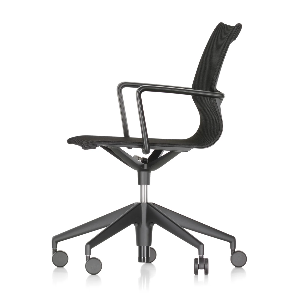 Physix Studio von Vitra ist ein reduzierter Bürostuhl mit komfortabler Sitzschale und höhenverstellbarem Fünfsternuntergestell auf Rollen. Der italienische Designer Alberto Meda hat bei seinem Entwurf die Idee gehabt, eine durchgehende Sitzschale zu kreieren, indem ein Textil zwischen zwei seitlichen Holmen verspannt wird.
