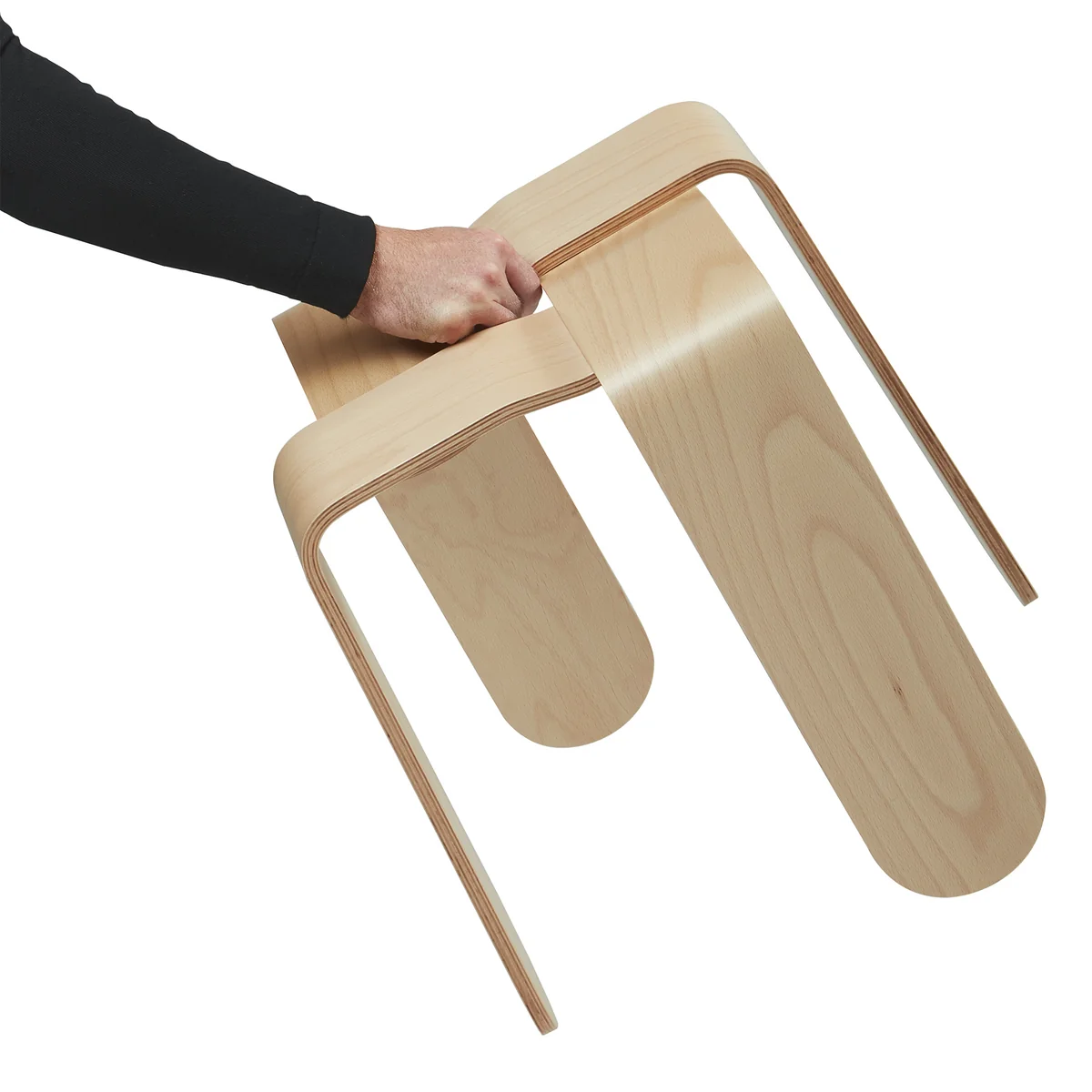 Der Hocker wird aus Buchenfurnier hergestellt und ist in verschiedenen Farben erhältlich.