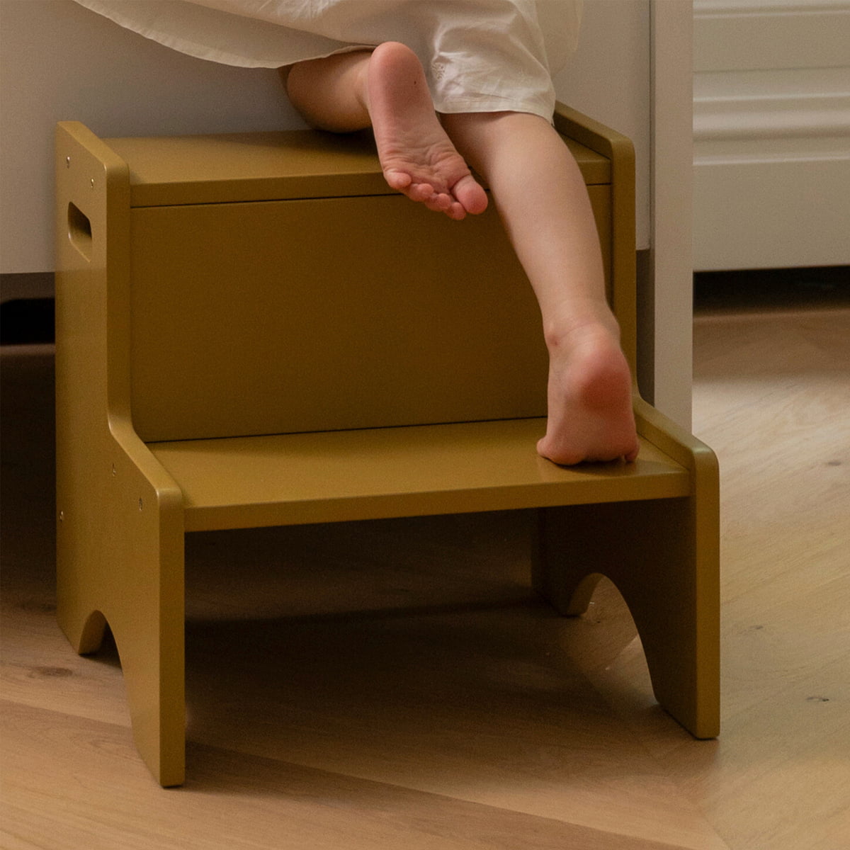 Der Tritthocker ist stabil und sicher, ideal für Kinder, die lernen, sich selbstständig zu bewegen. Die Stufen ermöglichen es dem Kind, sich problemlos zu Waschbecken, Schränken oder Regalen zu nähern.