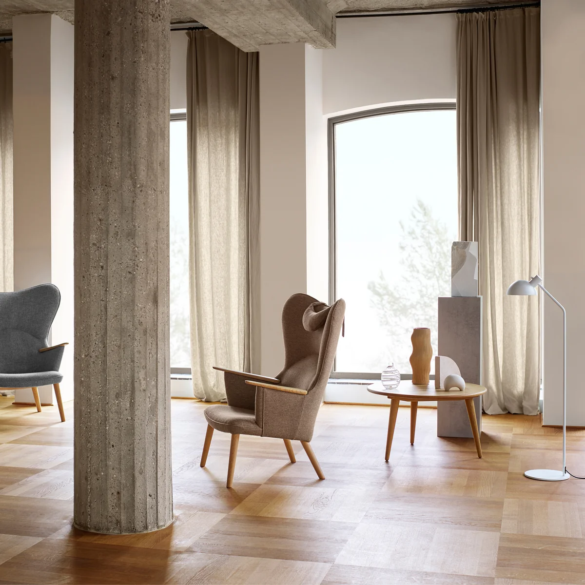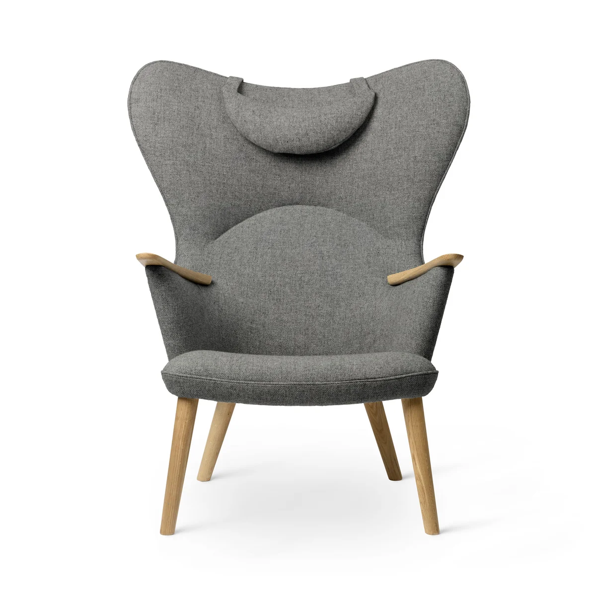 Der liebevoll als Mama Bear Lounge Chair bezeichnete CH78 von Carl Hansen wird definiert durch einladende Kurven, die eine warme Umarmung bieten. Sein besonders ästhetischer Charakter ergibt sich aus der Art, wie er weiche, abgerundete Formen mit dynamischen Geometrien ausgleicht und aus feinen Details wie den hölzernen Krallen auf den Armlehnen.