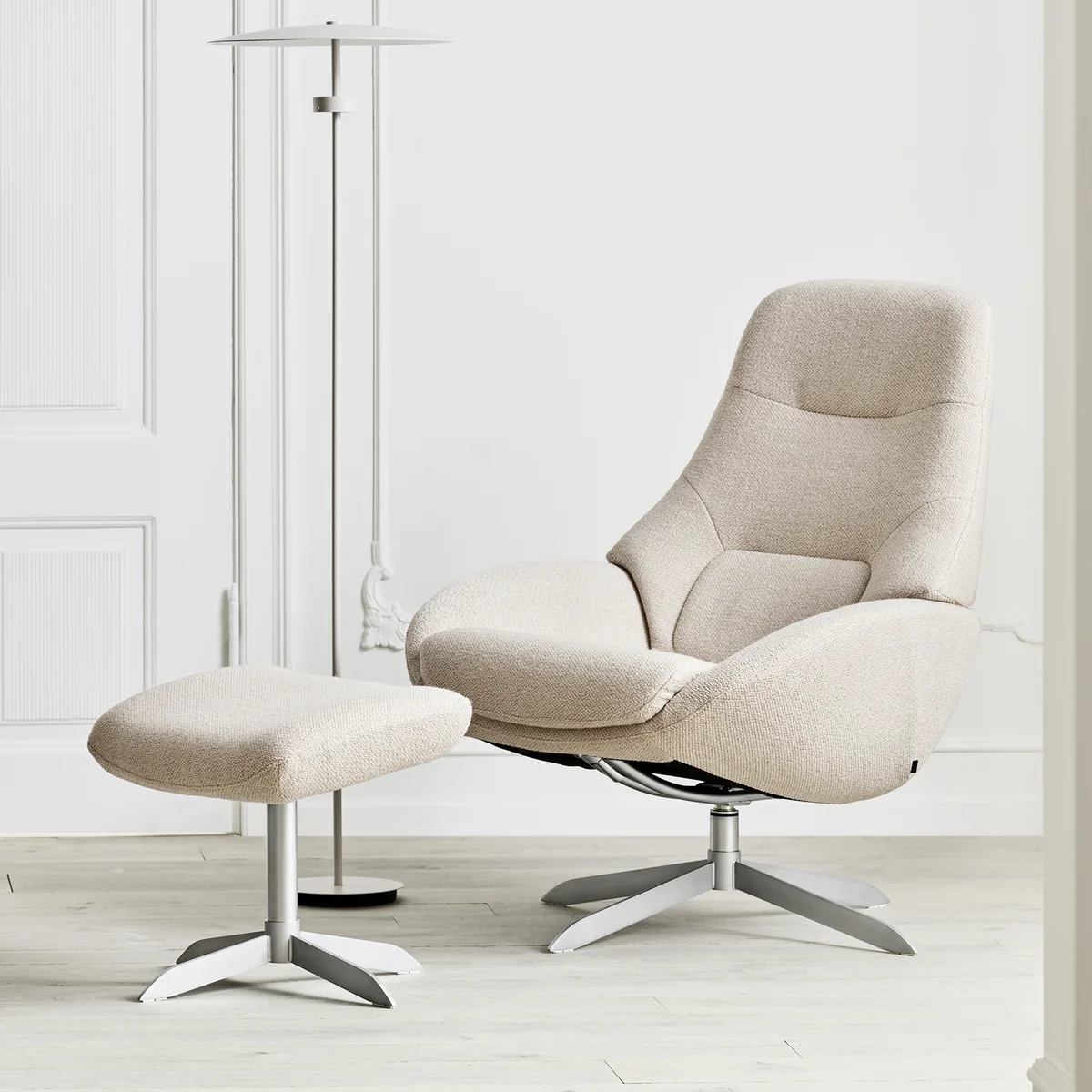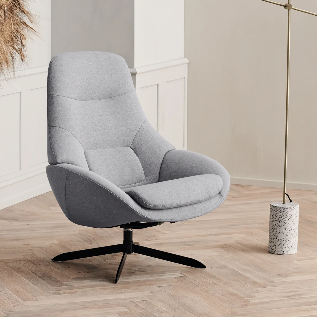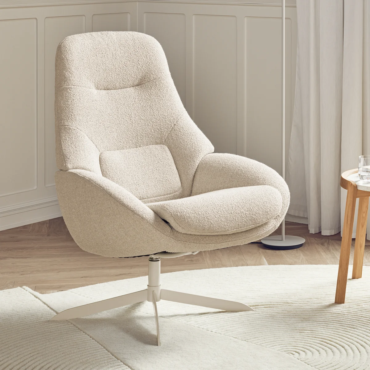 Der Saga Sessel von Bolia ist ein zeitloser Drehsessel, der speziell für erholsame Pausen und bequeme Nickerchen konzipiert wurde. Seine geschwungenen Konturen bieten eine hervorragende Ergonomie und sind aus weichem Schaumstoff geformt, um eine perfekte Unterstützung für den Körper zu gewährleisten. Das Gestell wird aus lackiertem Stahl gefertigt.