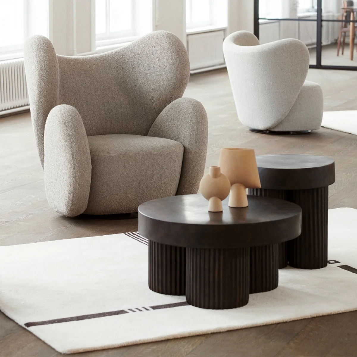 Mit seiner vereinfachten, blockartigen Struktur ist der Big Big Sessel von Norr11 eine Neuinterpretation eines klassischen Art-Déco-Lounge-Sessels. Die voluminösen Formen sind in vier vollgepolsterte Objekte unterteilt, die jeweils nach ergonomischen Gesichtspunkten gestaltet und zu einer neuen Konstellation zusammengefügt sind. Hinter dem Entwurf stecken Kristian Sofus Hansen und Tommy Hyldahl.