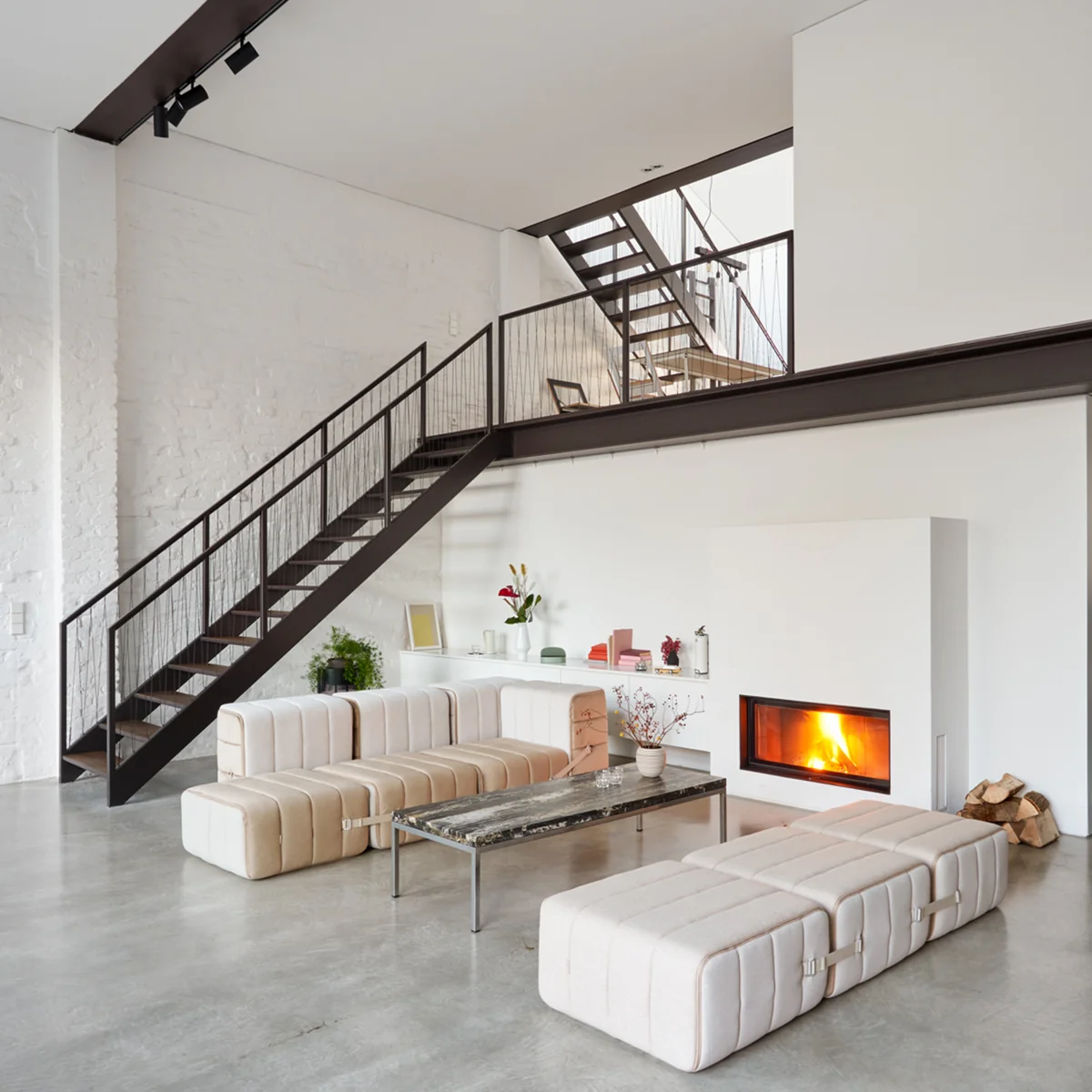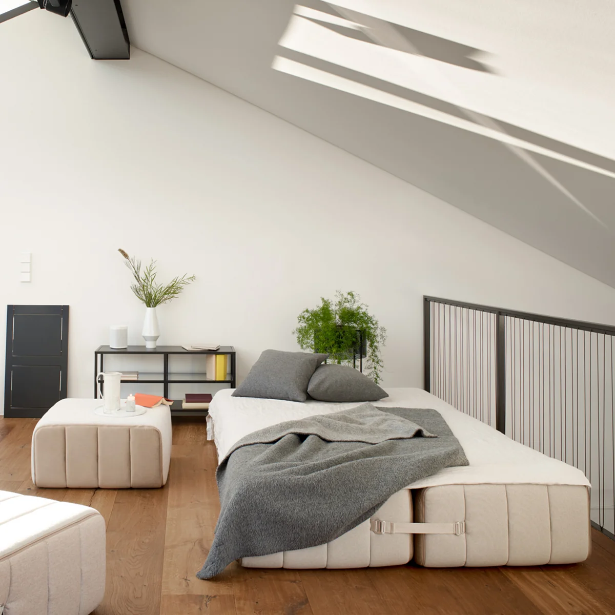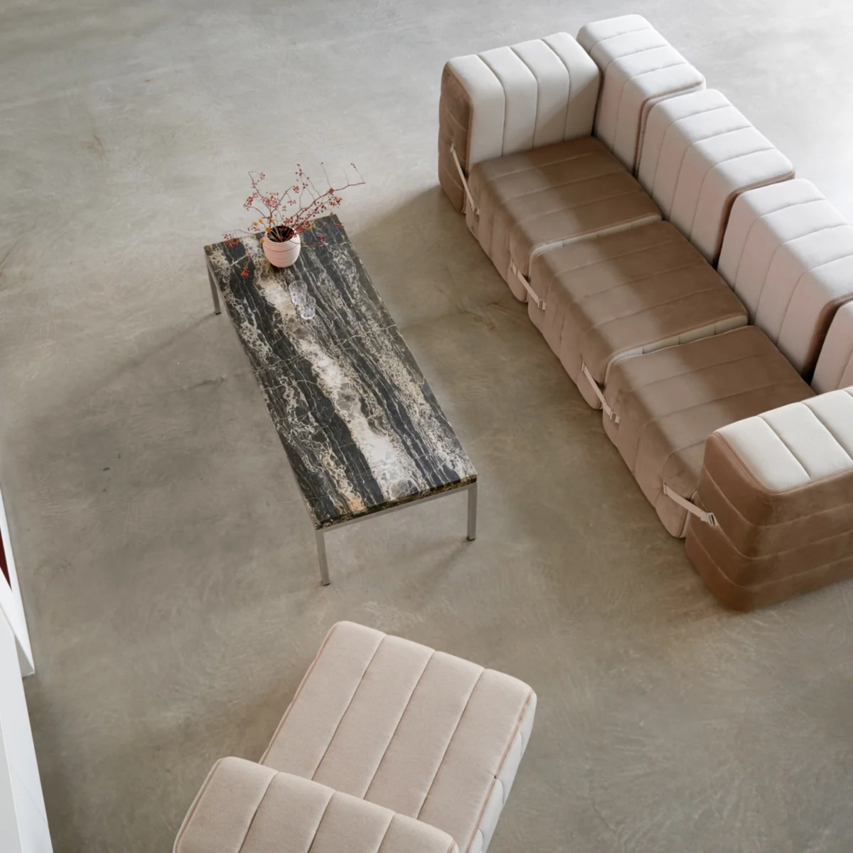 Das Curt Sofamodul von Ambivalenz ist in verschiedenen Farben und Stoffen erhältlich, die unendlich viele Möglichkeiten bieten. Es wird inklusive zweier Verbindungssysteme geliefert.