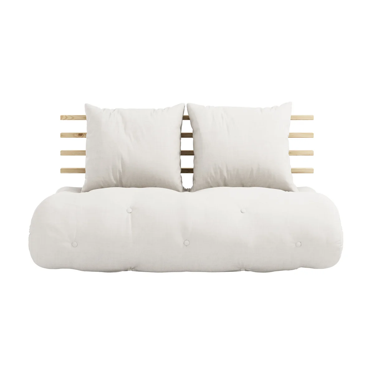 Das Shin Sano Sofa von Karup überzeugt durch zeitlosen Minimalismus und raffinierte Funktionen. Das Sofa verfügt über eine bequeme, dicke Futon-Matratze aus 15 cm Recycling-Mischfaser mit einem Kern aus 4 cm Schaumstoff, die von einem stilvollen Lattenrost aus Kiefernholz auf der Rückseite umgeben ist. Zieht man den Futon flach heraus, hat man in Sekundenschnelle ein schönes, großes Gästebett mit Kopfteil und zwei bequemen Kissen zum Anlehnen.