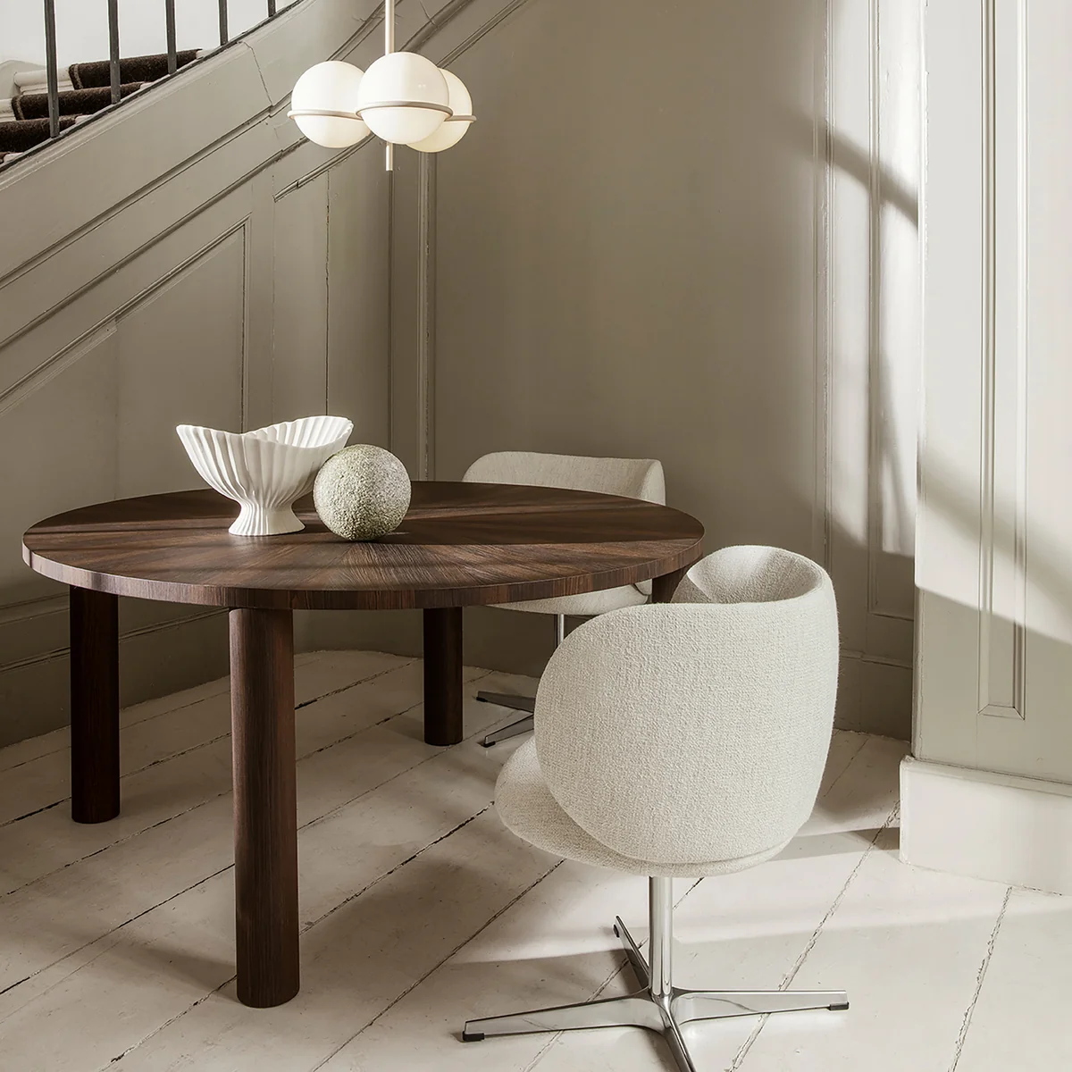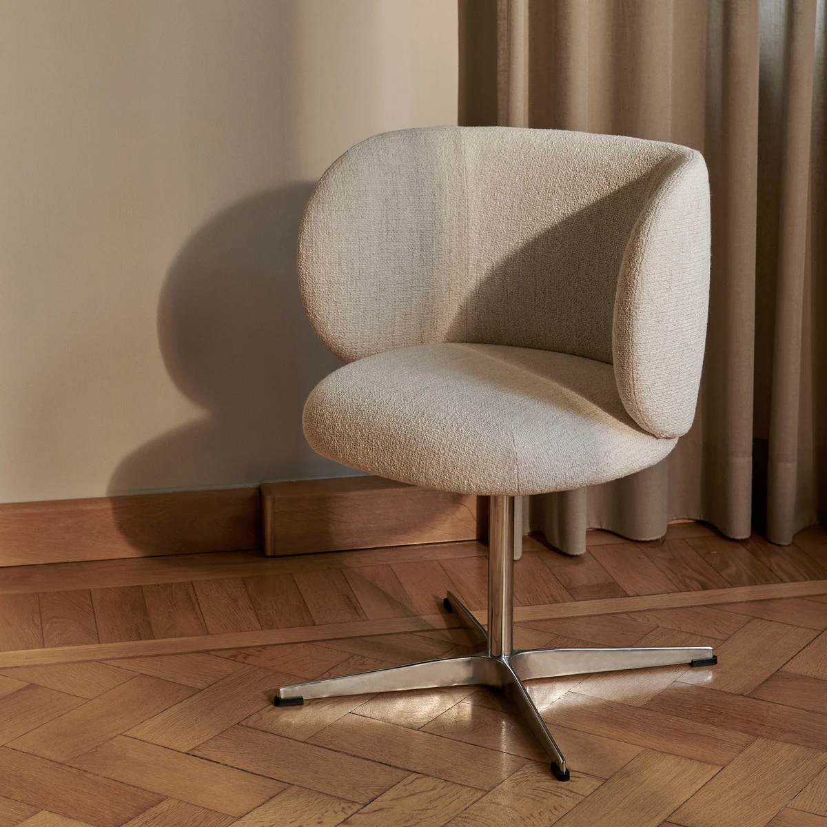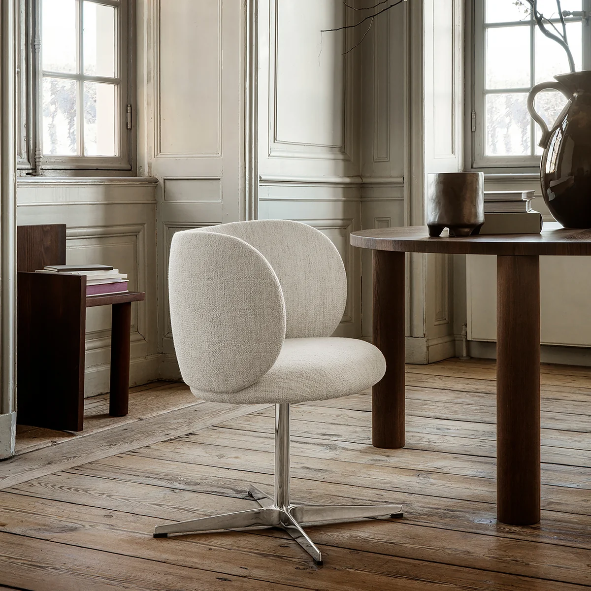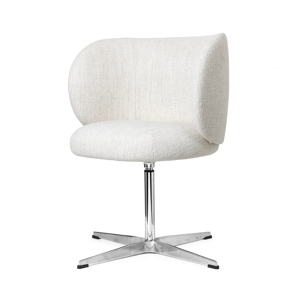 Der Rico Dining Chair (drehbar) aus dem Hause Ferm Living begeistert mit seinen tollen Kurven und dem üppigen Volumen. Die weichen Linien des Stuhl sorgen für einen freundlichen, umarmenden Ausdruck. Das funktionelle Drehgestell aus Aluminium bietet die robuste, drehbare Basis des Stuhl, während die Sitzfläche aus Formschaum mit Bouclé (35% Acryl, 24% Polyester, 19% Viskose, 14% Baumwolle, 5% Leinen und 3% andere Fasern) oder Hallingdal von Kvadrat (70% Schurwolle und 30% Viskose) überzogen ist. Rico kann wunderbar am Esstisch platziert oder als eleganten Schreibtischstuhl im Arbeitszimmer verwendet werden.