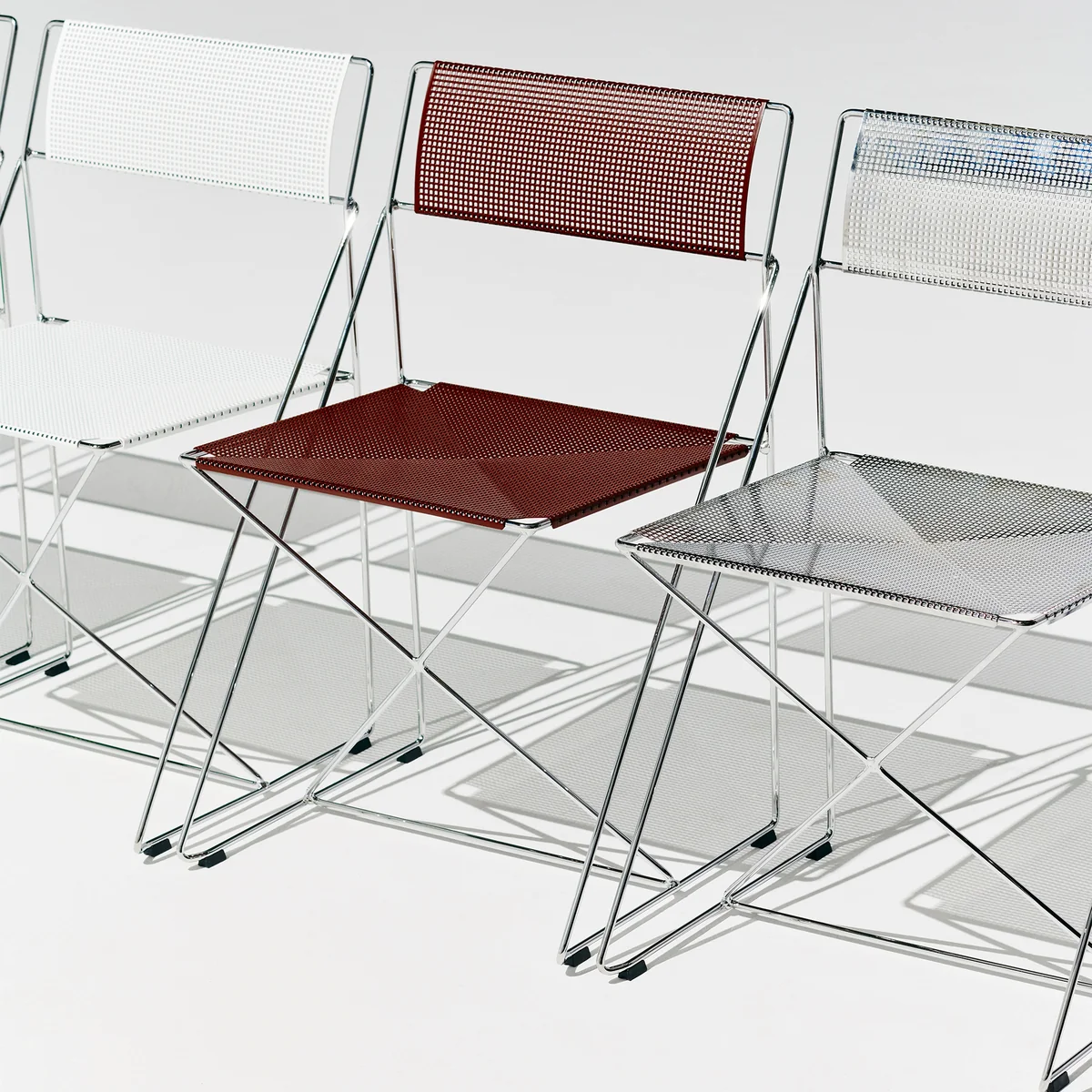 Das durchdachte Design zeichnet sich durch die markante X-Struktur aus, die dem Stuhl nicht nur visuelle Leichtigkeit, sondern auch Flexibilität und Stabilität verleiht. Mit sorgfältig ausgewählten Sitzfarben und verchromten Stahlbeinen ist der X-Line Stuhl eine elegante und funktionale Wahl für vielseitige Innenräume. Dank seines minimalistischen Ausdrucks, seiner Stapelbarkeit und Langlebigkeit eignet er sich gleichermaßen für private und geschäftliche Bereiche.