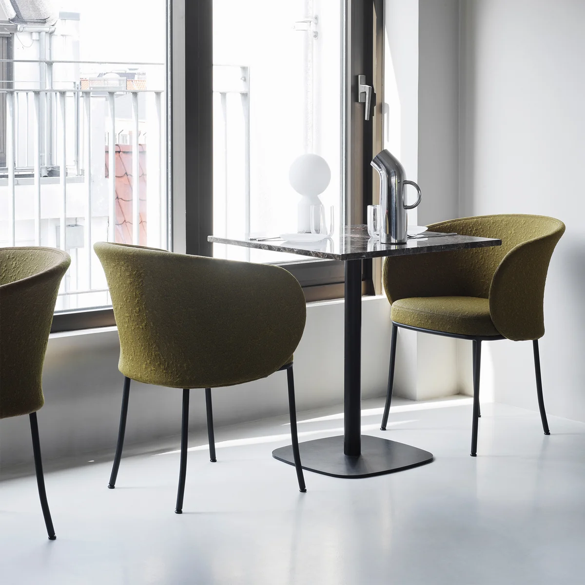 Die sanft geschwungene Rückenlehne folgt den natürlichen Körperkonturen und bietet auch bei längerem Sitzen angenehmen Halt. Eine leicht geneigte Sitzfläche sowie elegant abgewinkelte Stahlbeine sorgen für Komfort, Stabilität und eine beschwingte Optik. Gepolstert ist der Sessel mit Myr von Kvadrat, einem dreidimensionalen Strickgewebe aus 100 % recyceltem Polyester, das durch seine Struktur visuelle Tiefe und eine lebendige Oberfläche erzeugt.