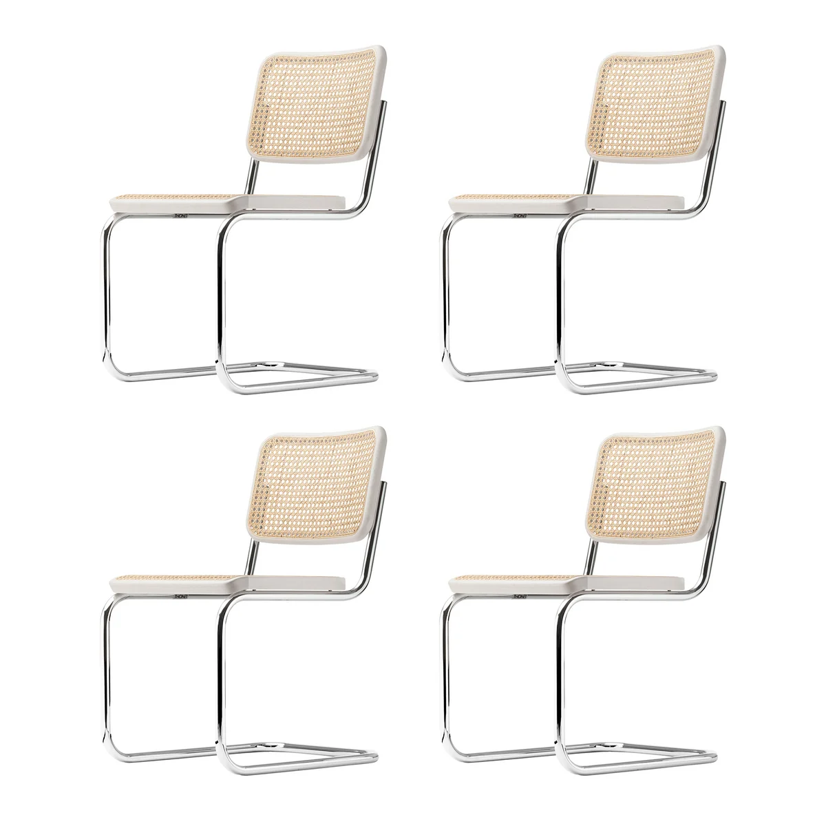 Durch seine ästhetische Reduktion und Klarheit passt der S 32 in viele private und öffentliche Bereiche: Konferenzräume, Wartezonen, Restaurants oder auch in das eigene Esszimmer oder Arbeitszimmer. Das Stahlrohrgestell ist in verchromt oder farbig lackiert erhältlich und die Holzteile sind aus gebeizter Buche oder geöltem Nussbaum. Die Bespannung mit Rohrgeflecht in verschiedenen Farben wird durch ein Kunststoffgewebe gestützt, welches für Stabilität sorgt.