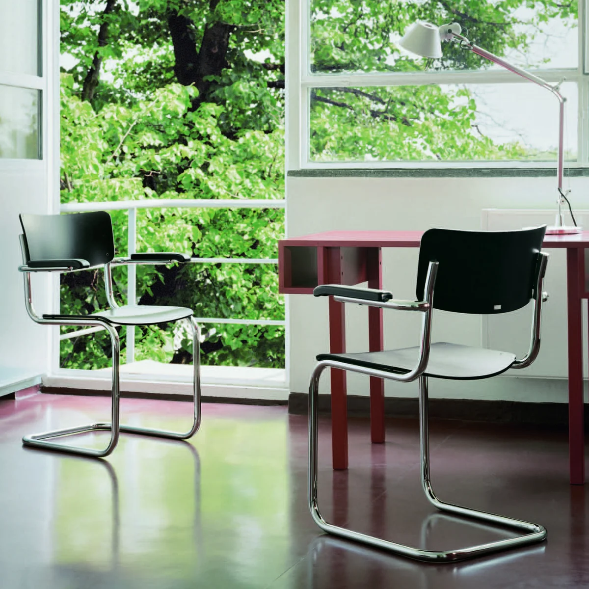 Der Stuhl aus Stahlrohr und Buchenholz wird durch die Armlehnen komplementiert und ist dabei so bequem, dass bei Sitz- und Rückenschale auf die Polsterung verzichtet werden kann. Das sanfte Schwingen des Stuhls macht ihn zu einer besonders bequemen Sitzgelegenheit im Geiste der Moderne.