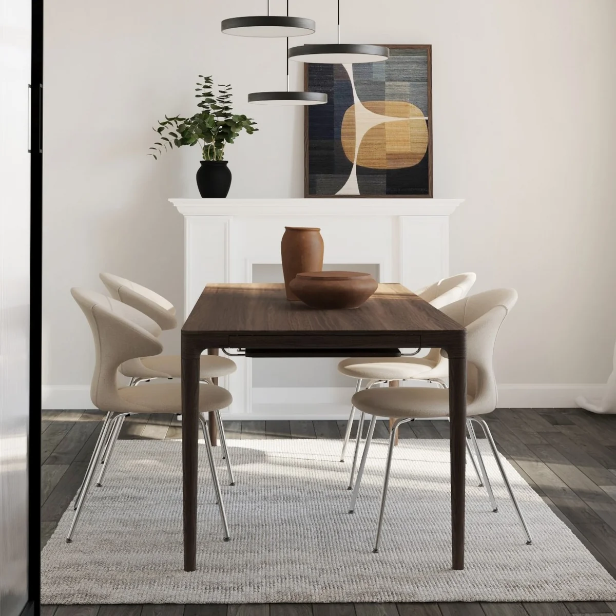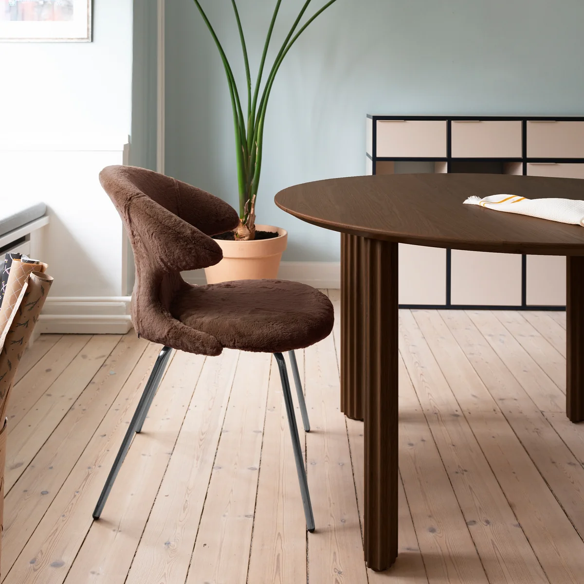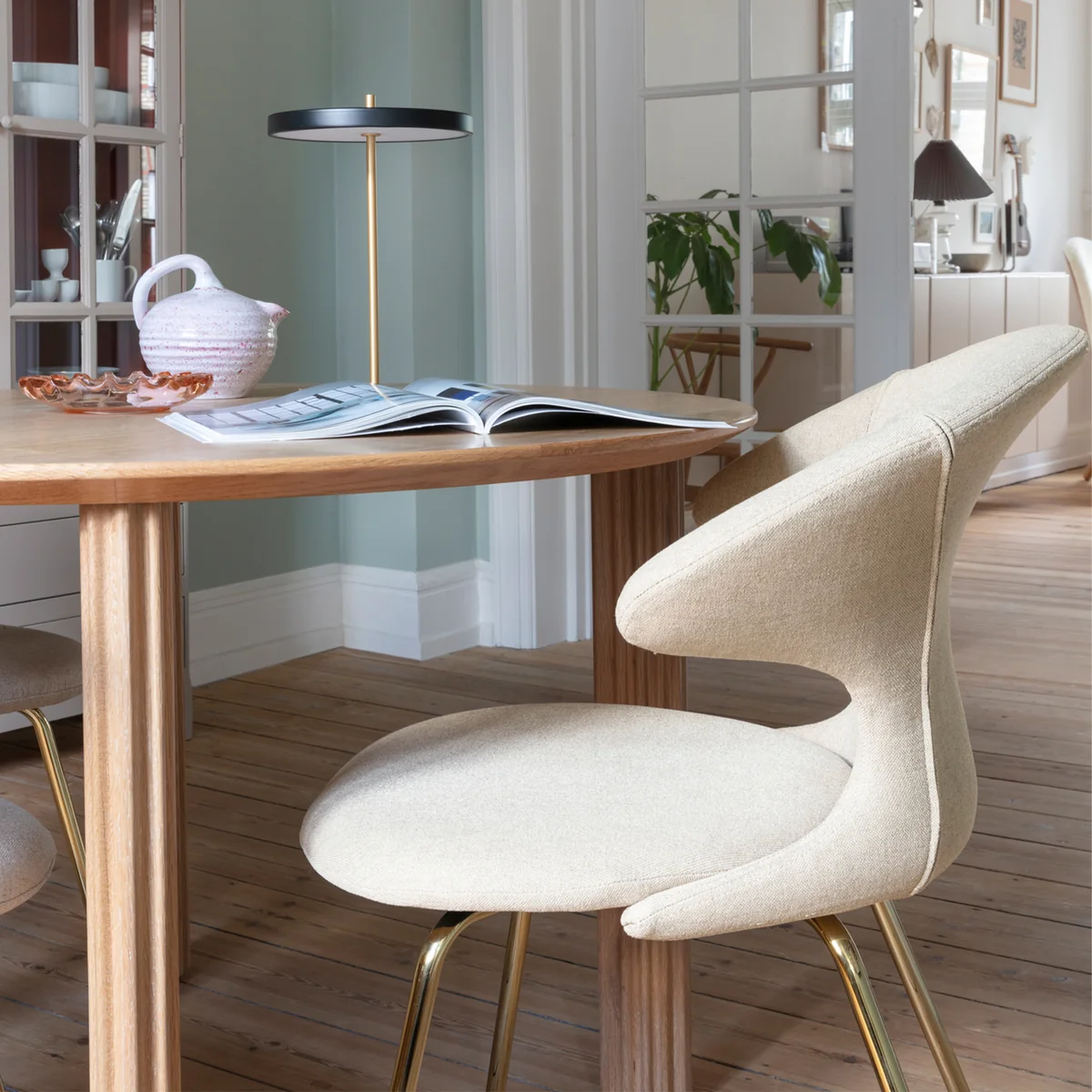 Seine gepolsterten Armlehnen umschließen den Nutzer sanft, sodass er sich geborgen fühlt und gemütliche Stunden in dem Stuhl verbringen kann. Die Polsterung der gesamten Sitzfläche bietet einen angenehmen Komfort. Zu mehreren am Esstisch arrangiert oder einzeln als Highlight im Flur oder Schlafzimmer arrangiert, ist der von Jonas Søndergaard entworfene Time Flies Stuhl ein echter Blickfang.