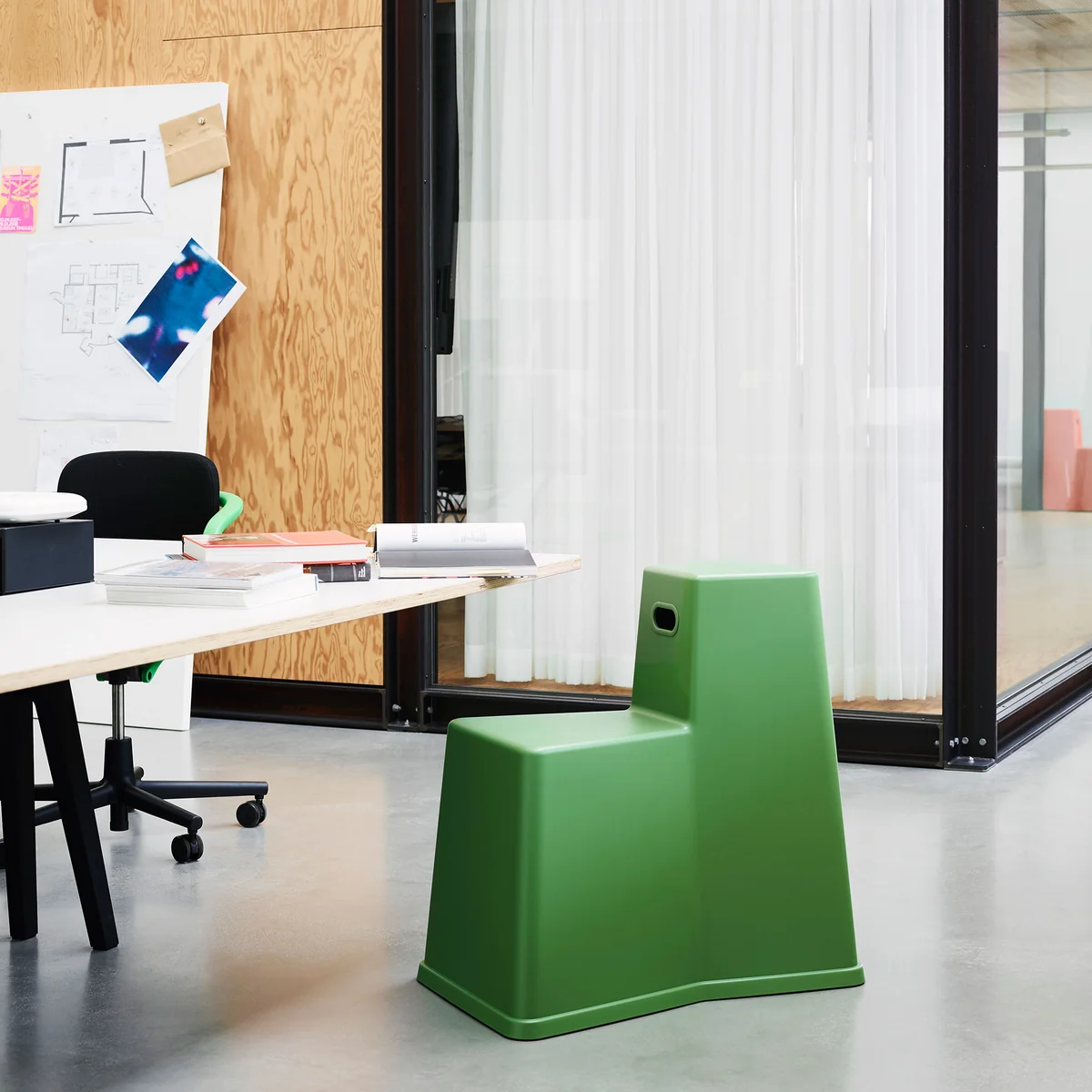 Auch als praktischer Tritt, um an hohe Regale oder Schränke zu gelangen, eignet sich der von Konstantin Grcic entworfene Stool-Tool. Aufgrund seines geringen Gewichts lässt sich das Sitzobjekt zudem hervorragend mit Hilfe des Griffs transportieren, sodass es flexibel an den gewünschten Einsatzort getragen werden kann. Damit eignet sich der Hocker besonders als Sitzgelegenheit im Co-Working-Space, für spontane Sessions draußen oder Brainstorming mit dem Kollegen.
