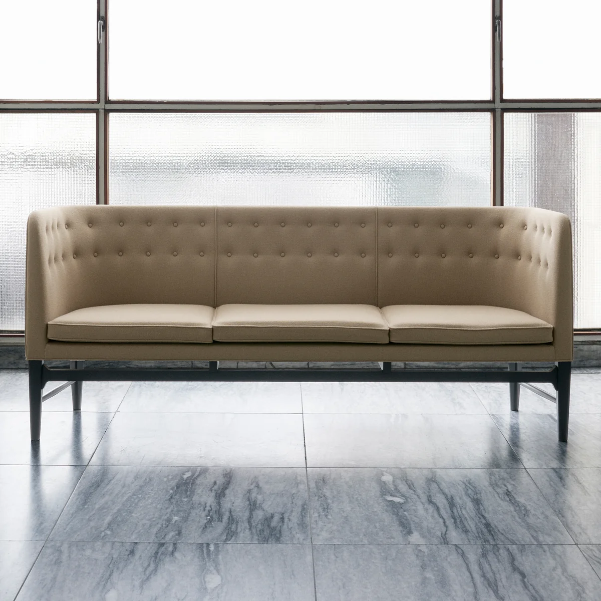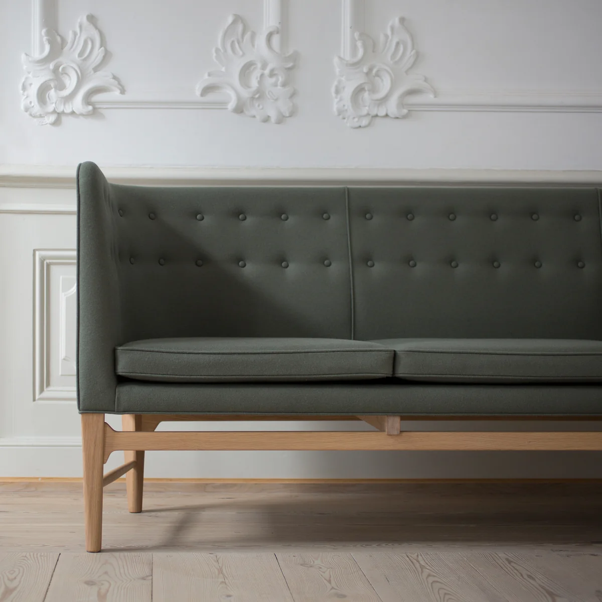 Das Mayor Sofa von &Tradition ist ein Ort der Entspannung in stilvoller Optik. Von Arne Jacobsen und Flemming Lassen entworfen, besticht das Sofa durch sein gradliniges Design, das sich hervorragend in jedes Ambiente einfügt. Hohe Arm- und Rückenlehnen vermitteln dem Nutzer ein Gefühl von Geborgenheit und Komfort. Gleichmäßig angebrachte Heftungen an den Polstern setzten zudem elegante Akzente und lassen das Sofa besonders luxuriös wirken, ohne dabei den gemütlichen Charme aus den Augen zu verlieren.