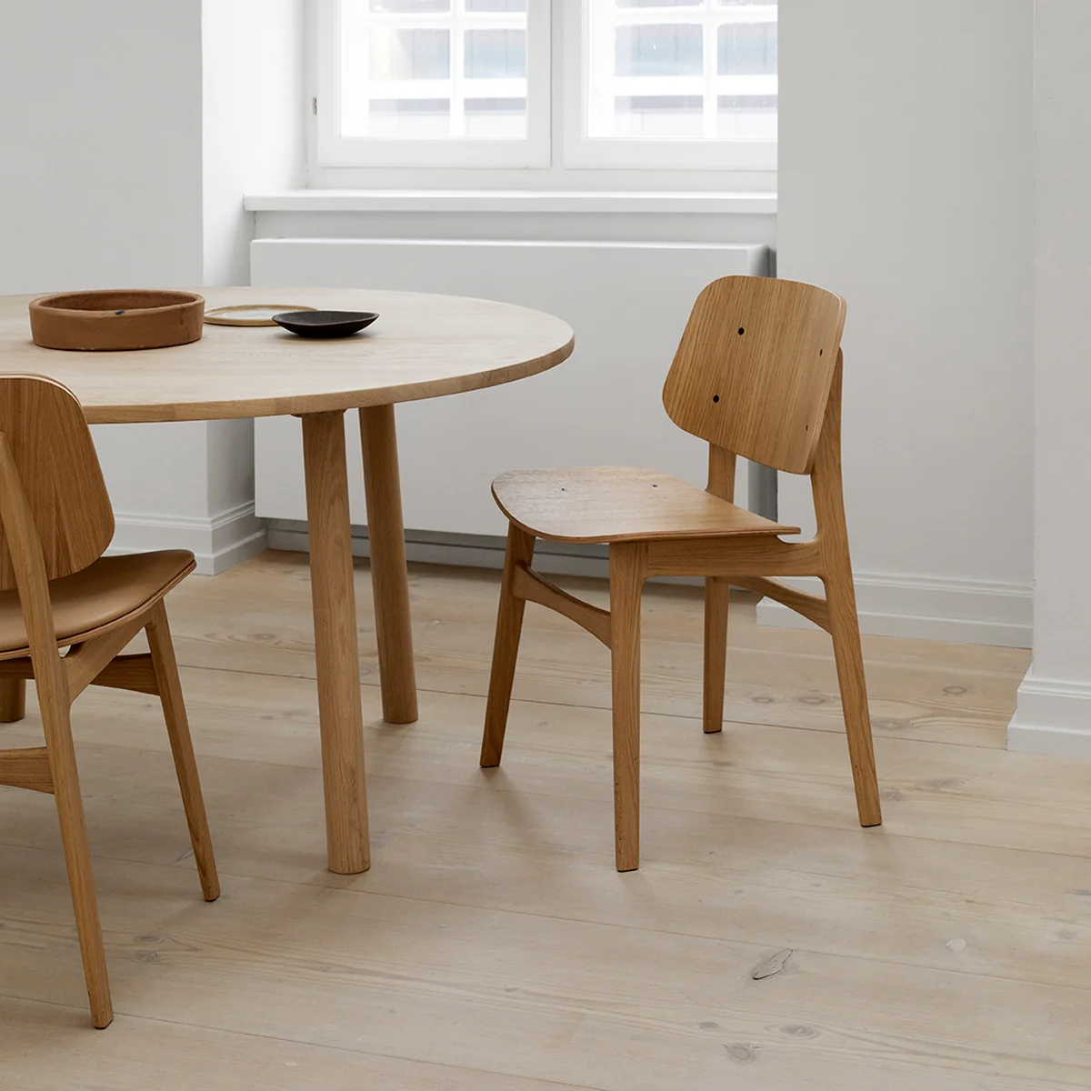 Den Entwurf für den Søborg Stuhl präsentierte Børge Mogensen 1950 mit der Intention einen Stuhl aus Sperrholz und Massivholz zu schaffen der funktional und gleichzeitig über Stunden hinweg bequem ist.