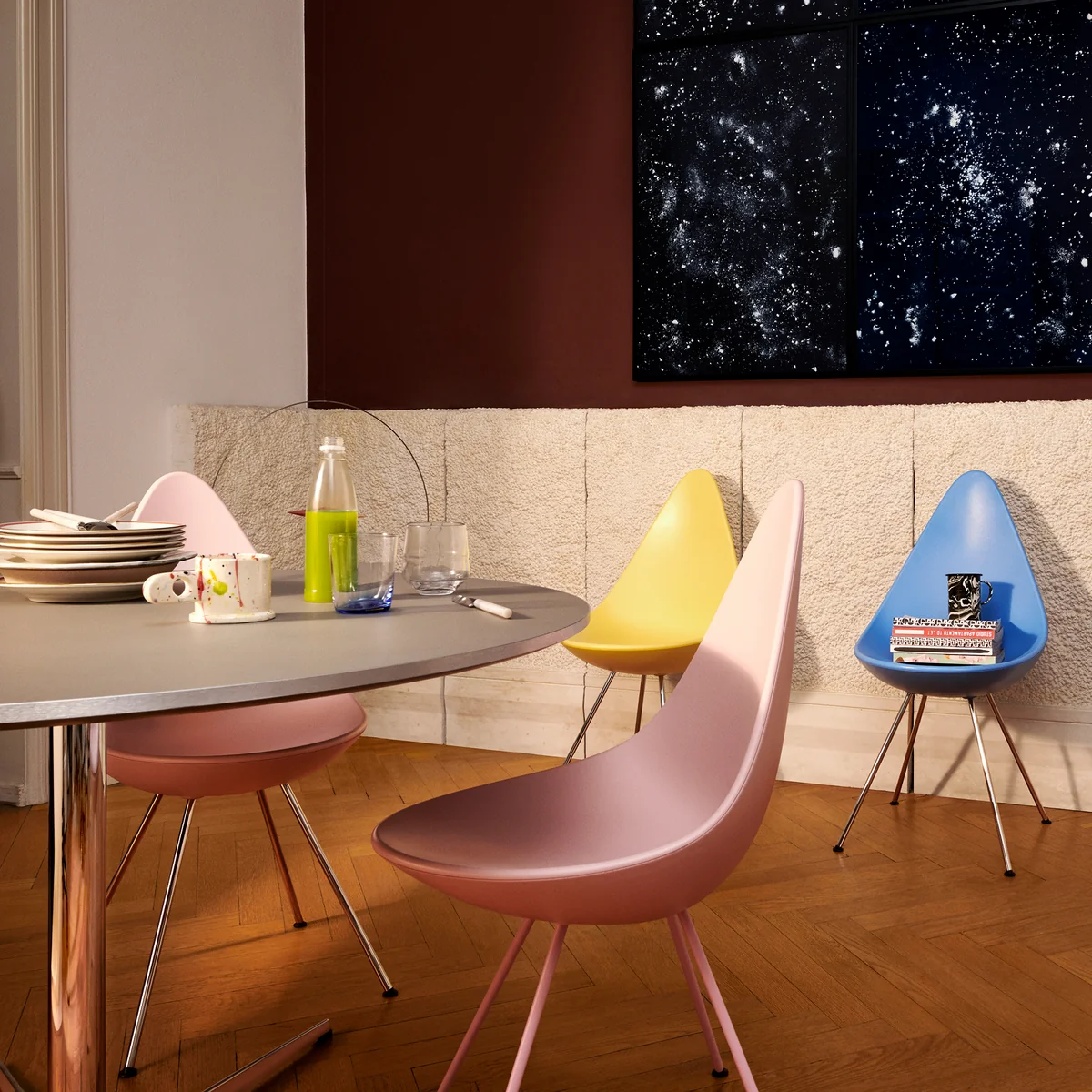 Der Fritz Hansen Drop Stuhl ist in vielen Farb- und Materialausführungen erhältlich. So passt er sich jedem Ambiente bestens an.