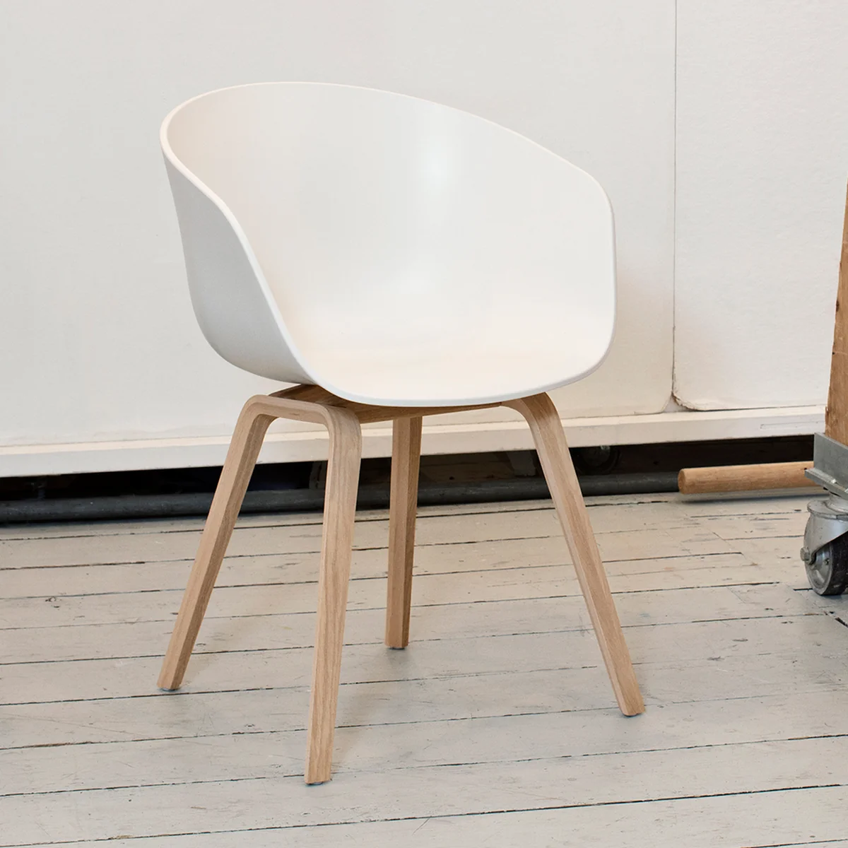 Der About A Chair AAC 22 besitzt Armlehnen und ein Holz-Vierbeingestell. Die ungepolsterte Sitzschale besteht aus durchgefärbtem Polypropylen, das Untergestell ist in verschiedenen Varianten erhältlich, sodass sich der Stuhl sowohl im einfarbigen, monochromen Look präsentiert oder mit einem Holz-Untergestell.