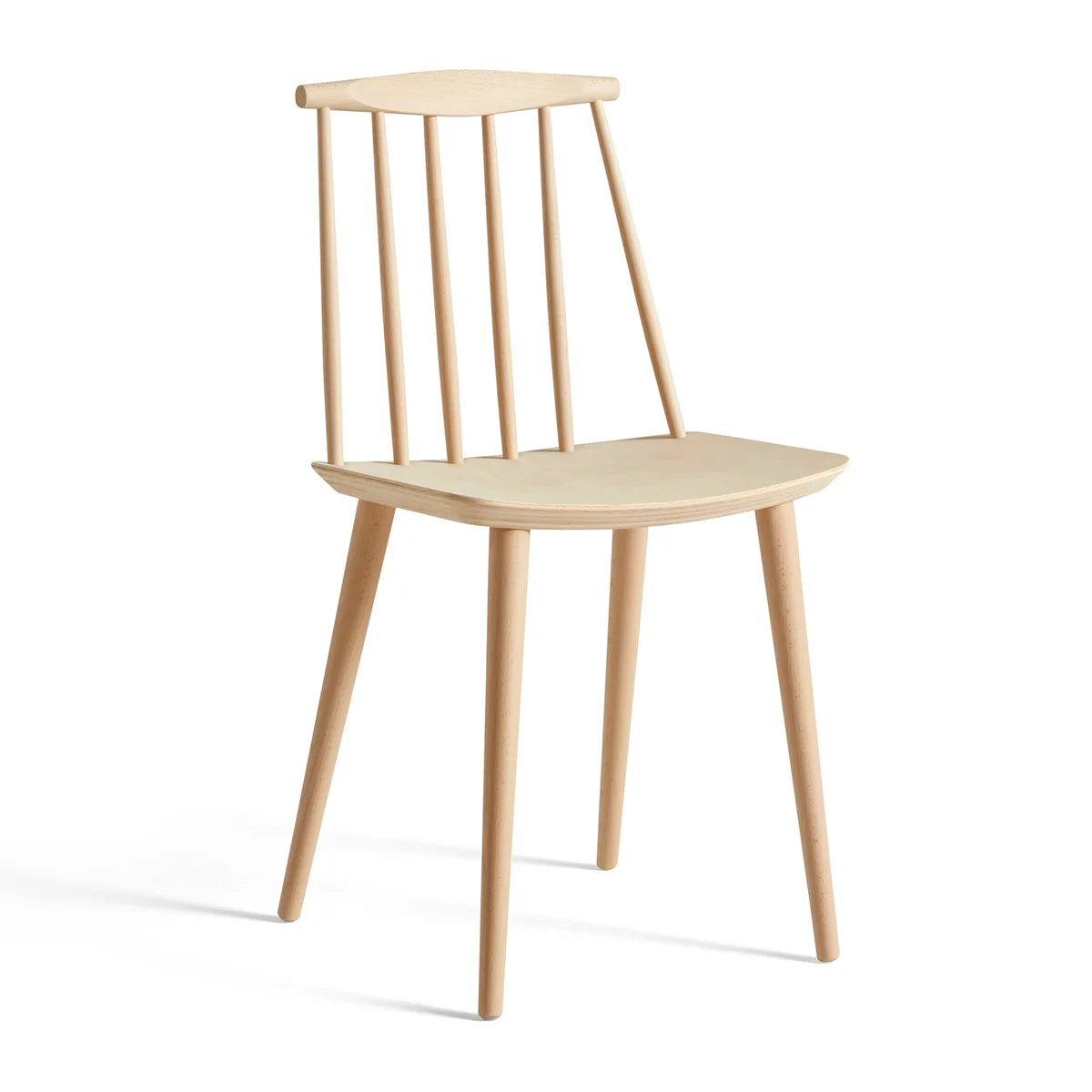 Die Fertigung aus Buchenholz und die schlanke Form der Stäbe an der Rückenlehne geben dem J77 Chair von HAY eine Anmutung, die zugleich leicht und doch massiv wirkt. Die breite Sitzfläche macht den J77 bequem, während er sich mit seinem klassisch-minimalistischen Design in ganz unterschiedliche Umgebungen einfügen lässt.
