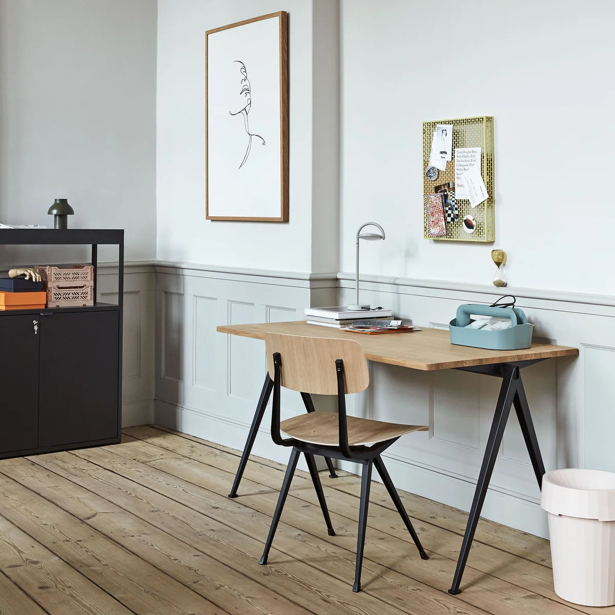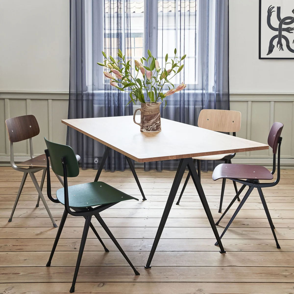 Der Result-Stuhl wurde urspünglich bereits 1958 von Friso Kramer und Wim Rietveld in den Niederlanden entworfen. Ein Jahr später folgte die passende Pyramid Kollektion. Für die Neuauflage arbeitet HAY mit Ahrend, dem ursprünglichen Hersteller der Möbel, zusammen.