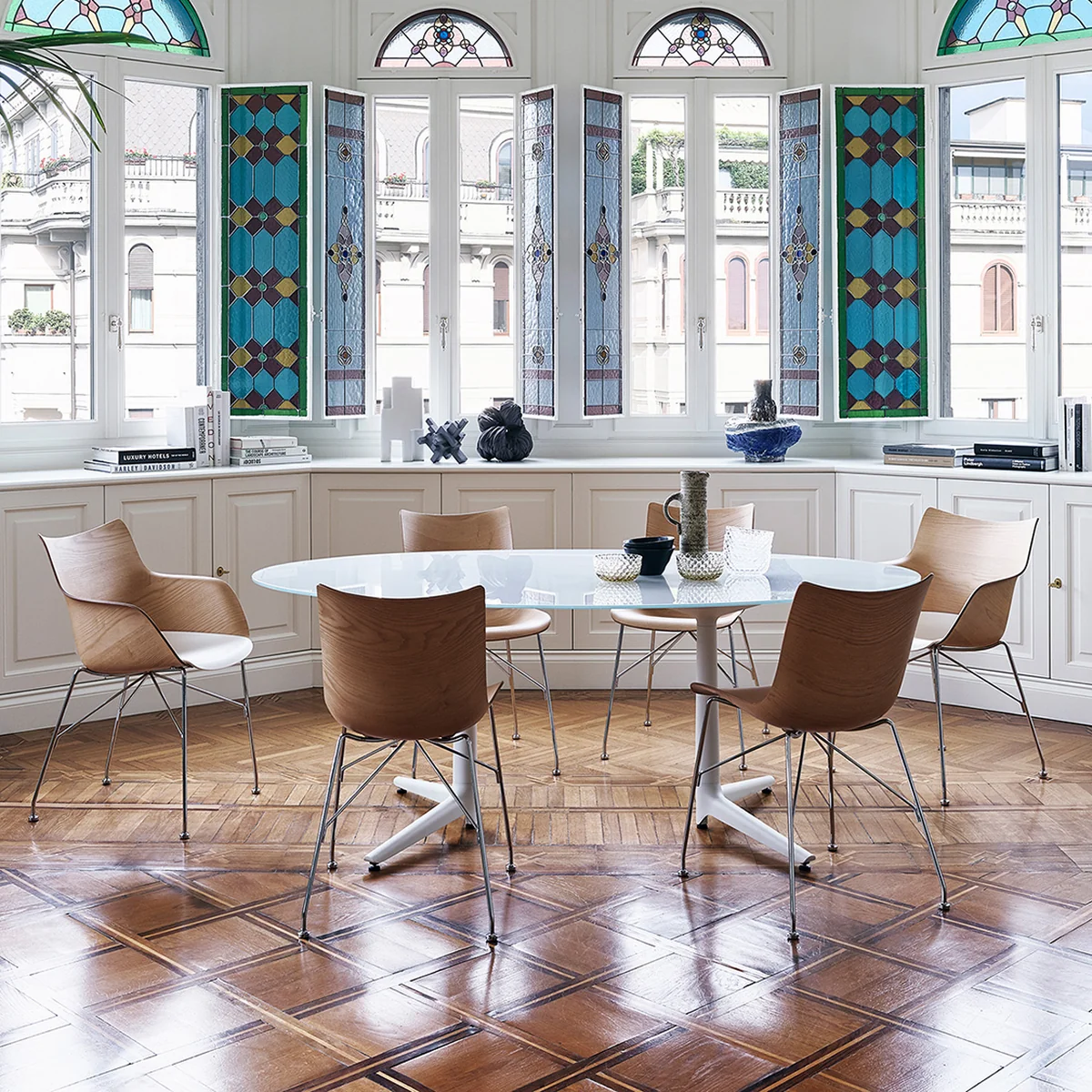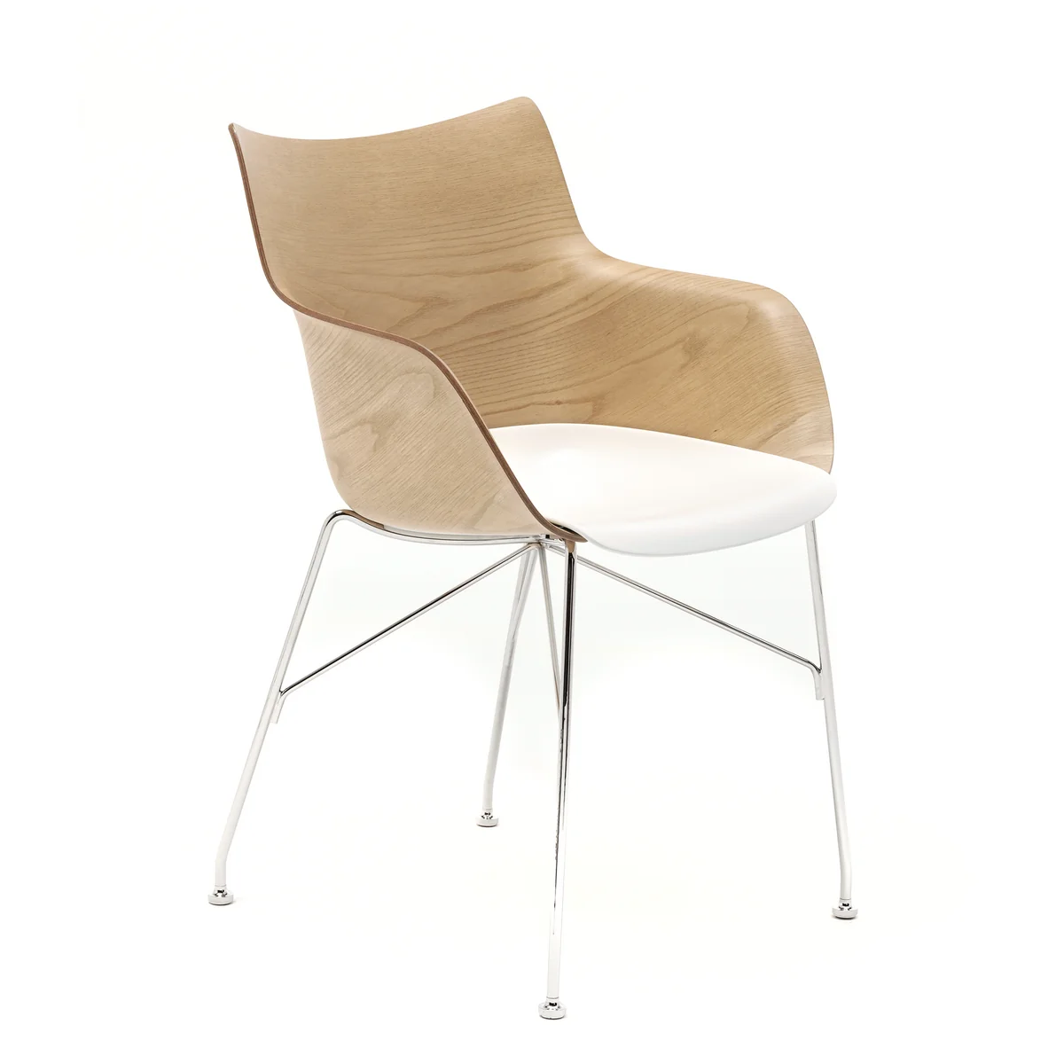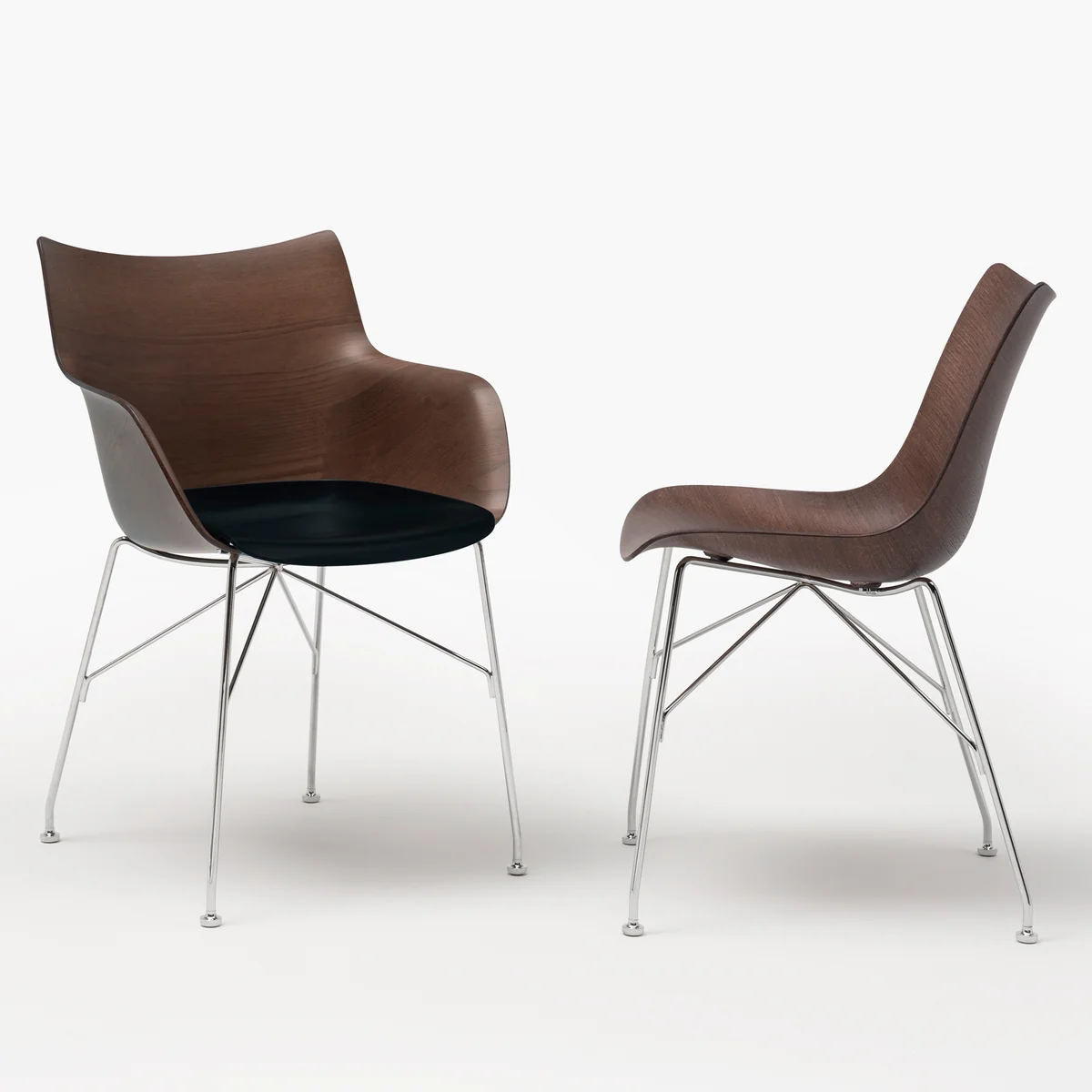Der Q/Wood Armlehnstuhl von Kartell ist ein zeitloser und eleganter Stuhl mit Armlehnen, der sowohl allein als auch zu mehreren am Esstisch zum Hingucker wird. Der Stuhl überzeugt durch seine weichen Rundungen und die filigranen Beine. Entworfen wurde Q/Wood von Philippe Starck als Teil der Smart Wood Serie. Die Serie umfasst Sitzgelegenheiten mit Sitzschalen aus Holz, die mit innovativer 3D Technologie optimal gebogen werden und sich so dem Körper perfekt anpassen.
