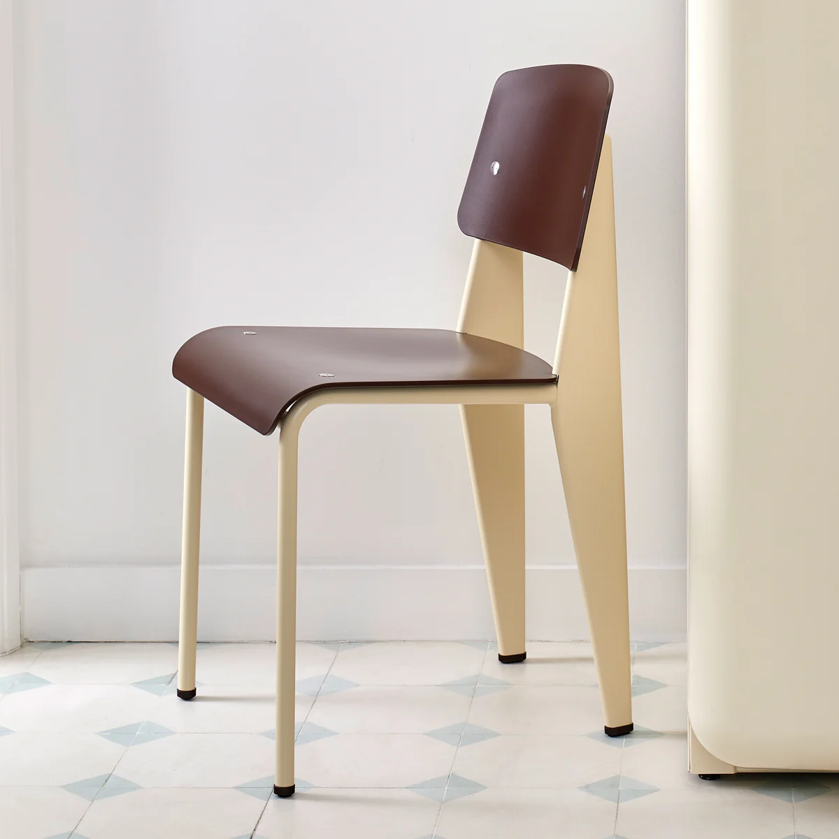 Der Standard ist ein Sinnbild für Prouvés architektonischen Designansatz: Der Stuhl folgt den Regeln der Zweckmäßigkeit und zeigt dabei offen seine Konstruktion. Die Materialien sind ebenso zeitlos wie dir Konstruktion: Vitra fertigt den Prouvé Standard Stuhl aus Stahl und Holz. Der Stuhl ist in verschiedenen Farbvarianten erhältlich.