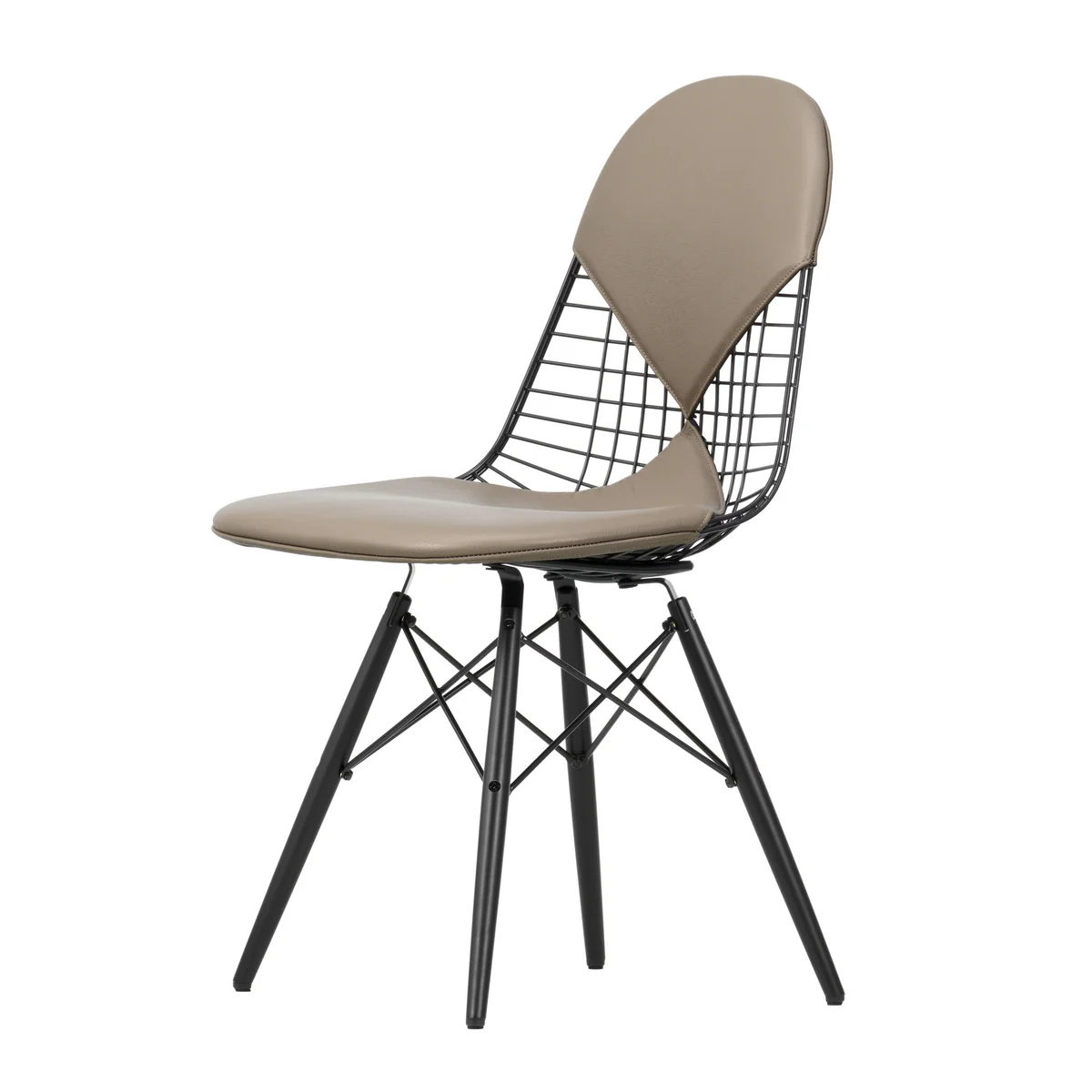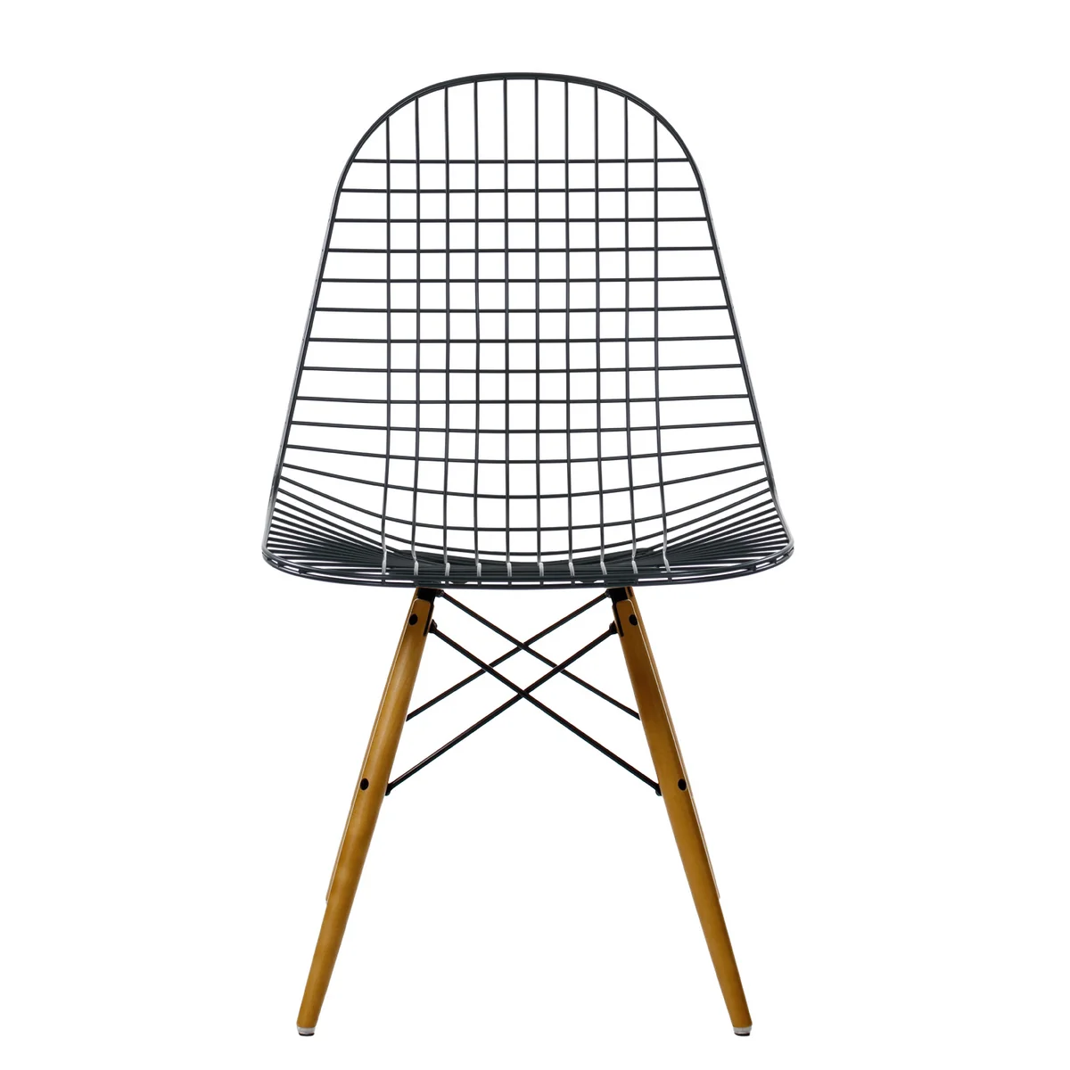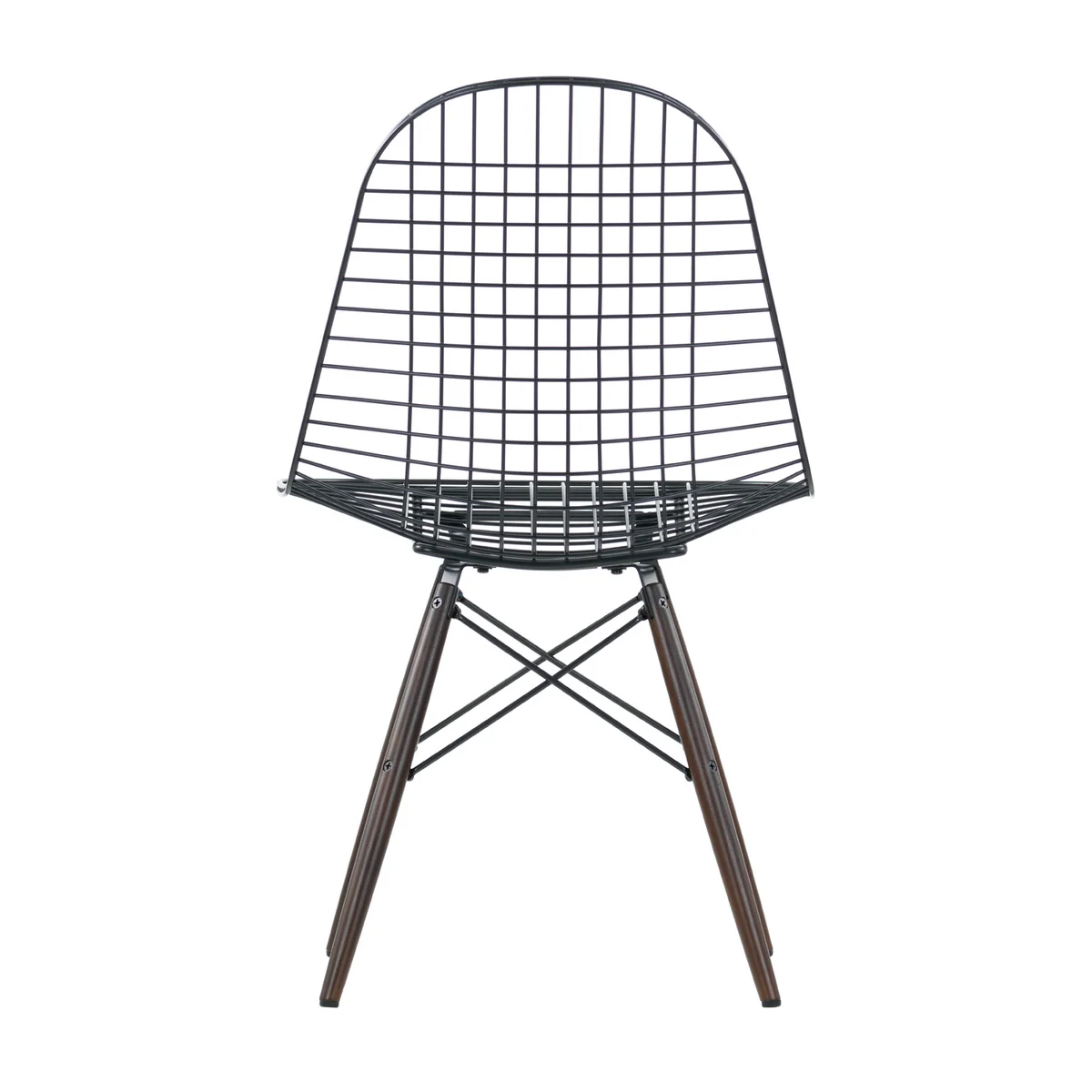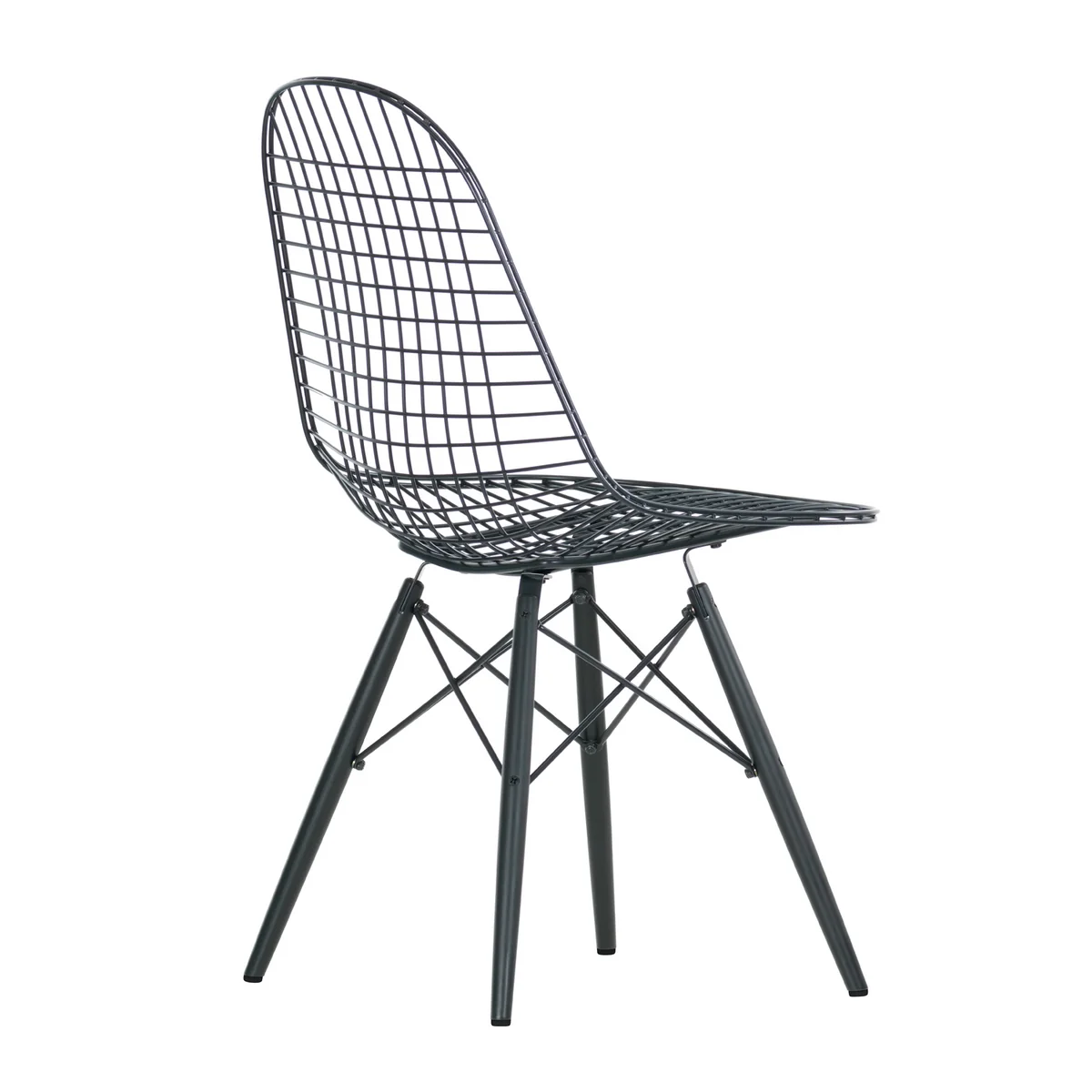 Die neue Version Wire Chair DKW betont mit ihrer dunklen Lackierung die Transparenz der Sitzschale aus Stahldraht, während das in drei verschiedenen Varianten verfügbare Holz-Untergestell aus Ahorn dem Stuhl einen wohnlichen Charakter gibt.