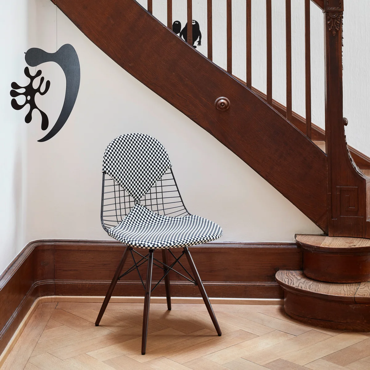 Mit dem Wire Chair DKW zeigt Vitra einen alten Bekannten mit frischer Ausstrahlung: Mit Holz-Untergestell und dunkler Sitzschale wurde der Klassiker von Charles & Ray Eames modernisiert.