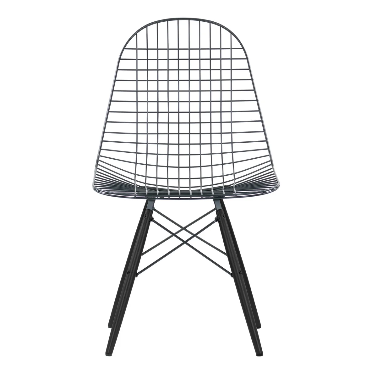 Die neue Version Wire Chair DKW betont mit ihrer dunklen Lackierung die Transparenz der Sitzschale aus Stahldraht, während das in drei verschiedenen Varianten verfügbare Holz-Untergestell aus Ahorn dem Stuhl einen wohnlichen Charakter gibt.