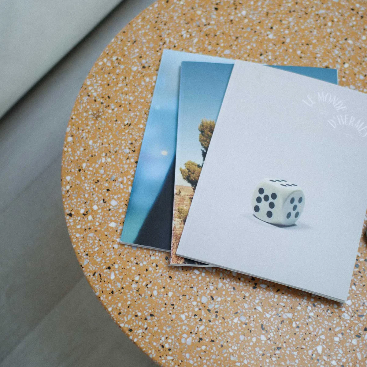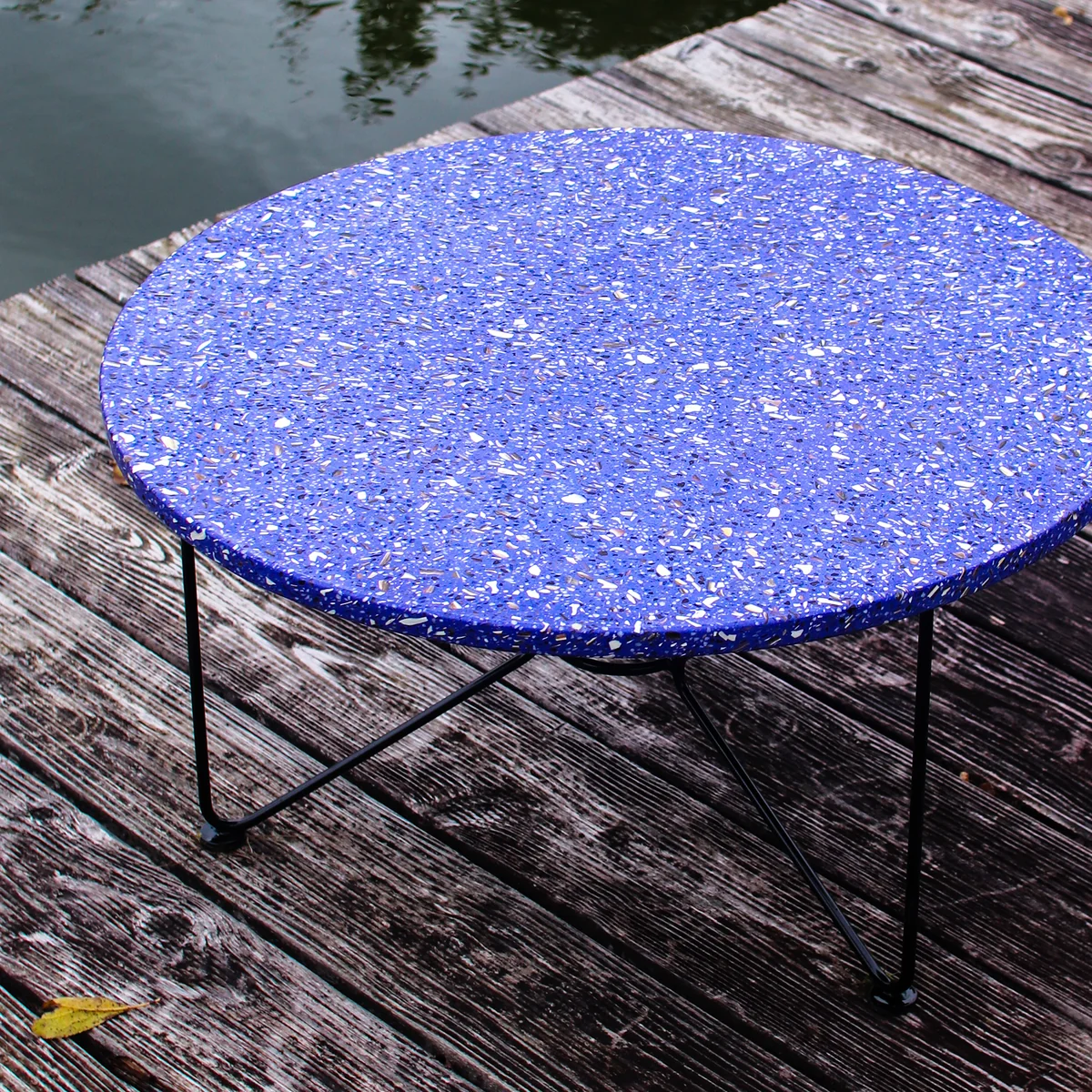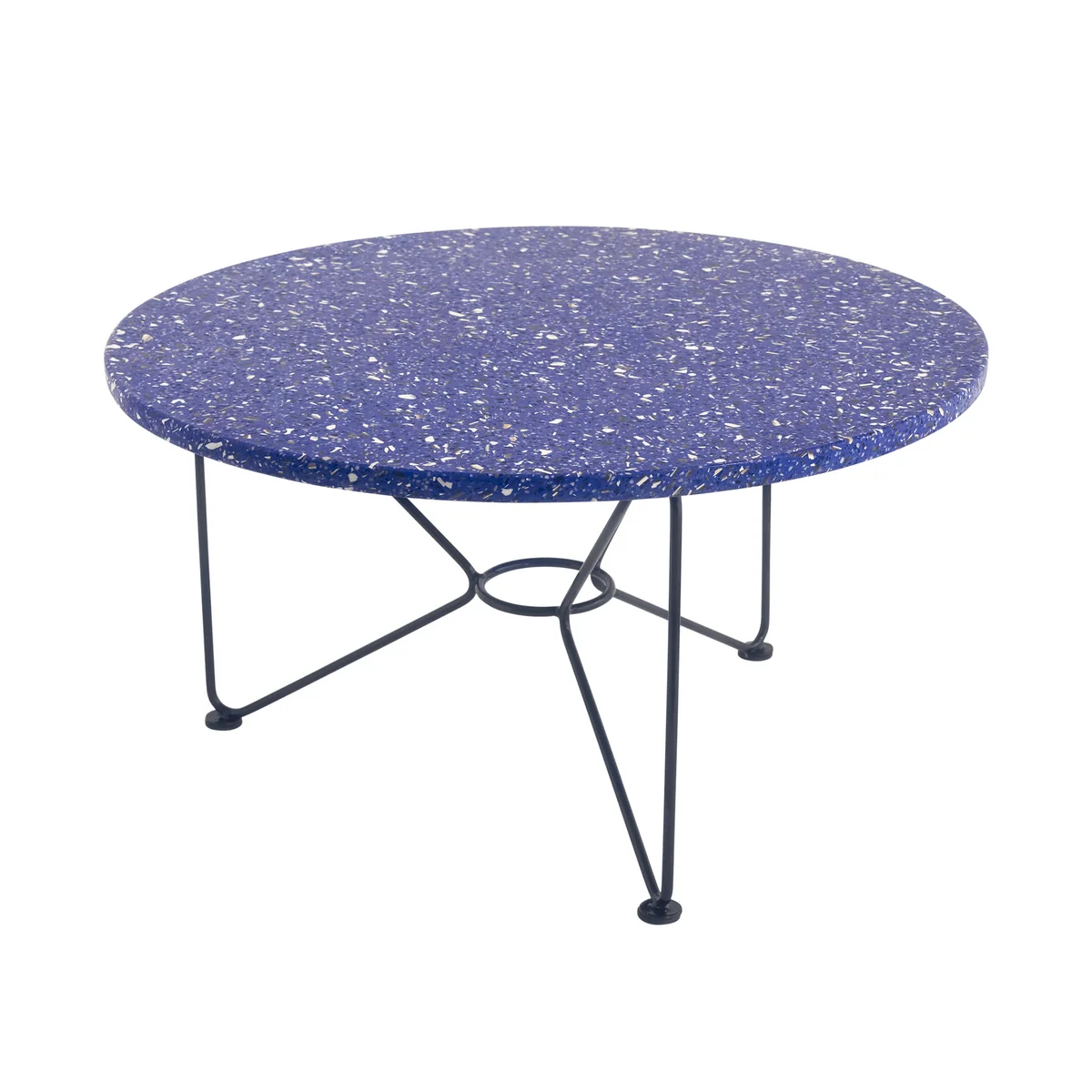 Der Low Table knüpft an die Gestaltung des Ring Tables an. Eine Terrazzoplatte wird von einem filigranen Metallgestell getragen, wobei ein zentraler Ring als Schlüsselelement fungiert, der geschickt die Tischbeine und die Tischplatte miteinander verbindet und ein anmutiges schmetterlingsförmiges Muster erzeugt.