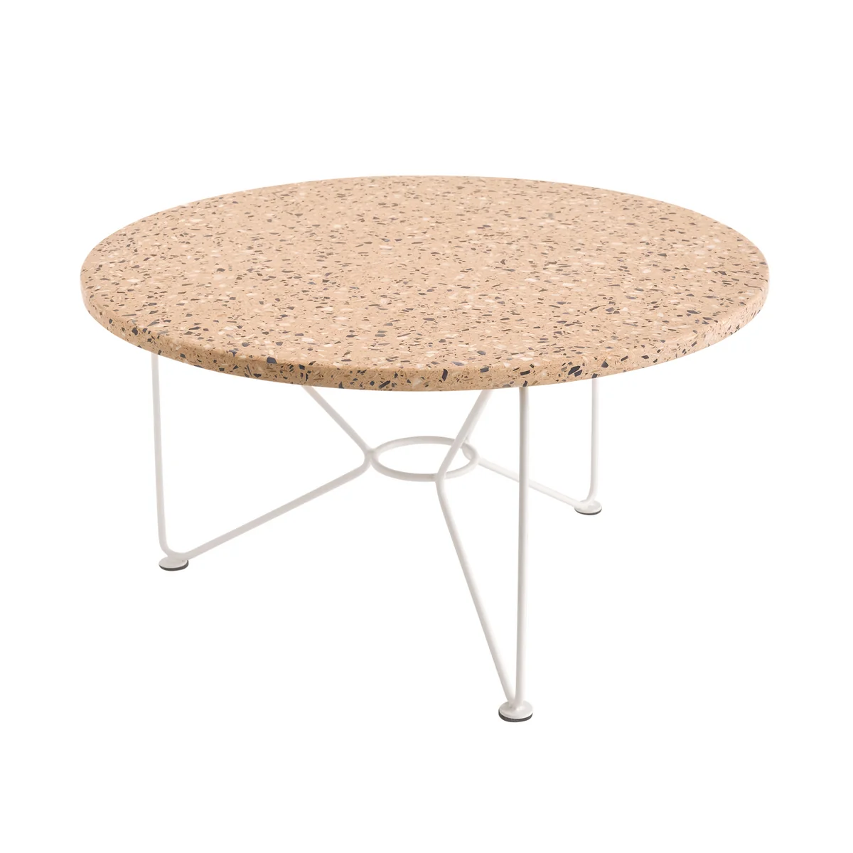 Der Low Table knüpft an die Gestaltung des Ring Tables an. Eine Terrazzoplatte wird von einem filigranen Metallgestell getragen, wobei ein zentraler Ring als Schlüsselelement fungiert, der geschickt die Tischbeine und die Tischplatte miteinander verbindet und ein anmutiges schmetterlingsförmiges Muster erzeugt.