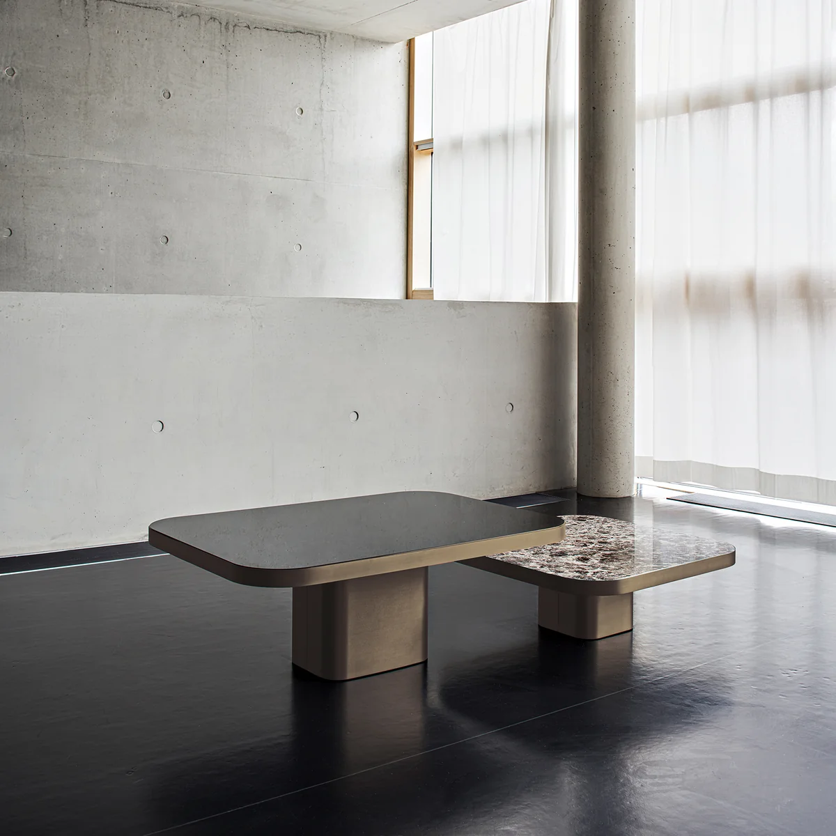 Der Bow Couchtisch von ClassiCon ist von den Linien und Designs der 1970er Jahre inspiriert. 2022 wurde der elegante Bow Tisch vom Brasilianer Guliherme Torres entworfen. Die mit Metall überzogene Oberfläche des Konstrukts ist typisch für die 70er Jahre, hat aber einen deutlichen zeitgenössischen Touch. Die mit Glas verkleidete Tischplatte schwebt förmlich über einem Sockel mit abgerundeten Kanten. Bow kann entweder als Couch- oder Beistelltisch genutzt werden und bietet mit seiner großen Tischfläche außerordentlich viel Platz.