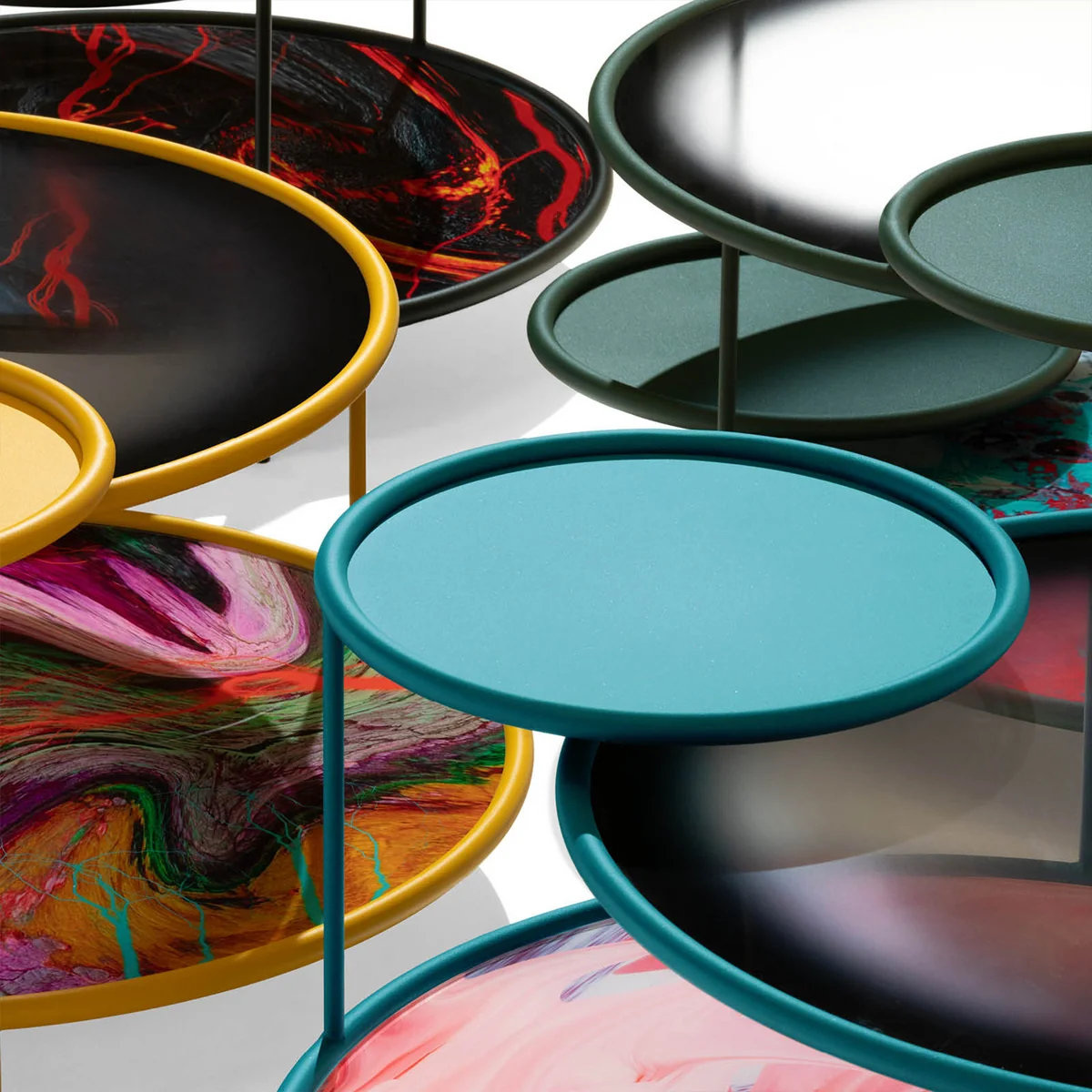 Inspiriert von den Kreisen und Ellipsen aus dem Spiel, ließ sich Elena Salmistraro zu dem Design verleiten: Vier verschiedene Kreise, zwei mit einem Radius von 40 cm und zwei mit einem Radius von 20 cm, sind in einen imaginären Kreis von 50 cm geschrieben und schaffen so ein neues Element, das von unsichtbaren, aber dennoch wahrnehmbaren geometrischen Beziehungen beherrscht wird. Die Schnittpunkte zwischen den verschiedenen Elementen werden zu den Beinen, die die vier verschiedenen Flächen tragen.