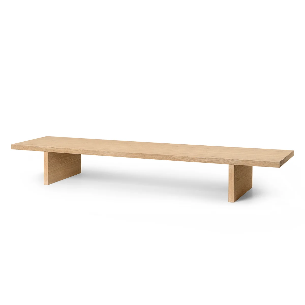 Der Kona Low Beistelltisch von Ferm Living, der als Ergänzung zum Kona Bett dient, besteht aus lackiertem Eichenfurnier und steht unter dem Bettrahmen hervor, um als praktische Ablage für ein Buch, eine Leuchte oder ein Glas Wasser zu fungieren. Um Platz zu sparen, kann man es tagsüber leicht unter dem Bett verschwinden lassen.