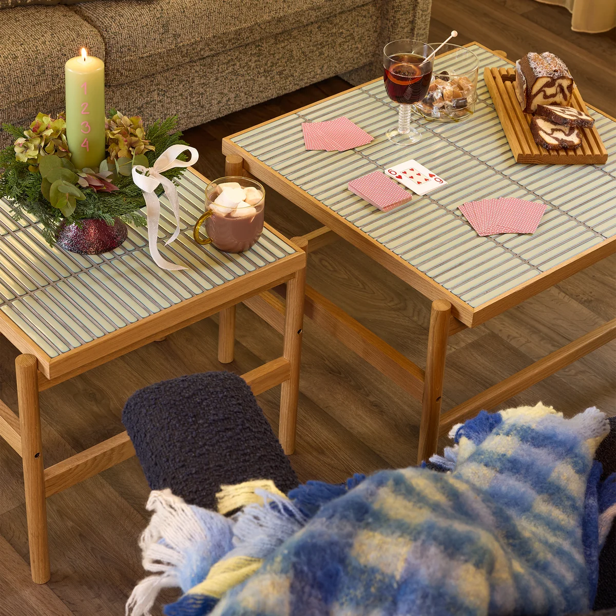 Der Tile Beistelltisch von Hübsch Interior verbindet verspieltes Design mit nachhaltigen Materialien. Die mintfarbene Tischplatte setzt einen frischen Akzent, während Eichenfurnier und Eichenholz für eine hochwertige, langlebige Basis sorgen. Die Fliesenoptik erinnert an nostalgische Kindermöbel, wird jedoch durch die elegante Materialkombination modern interpretiert. Ein vielseitiges Möbelstück, das jedem Raum Charakter und Stil verleiht.