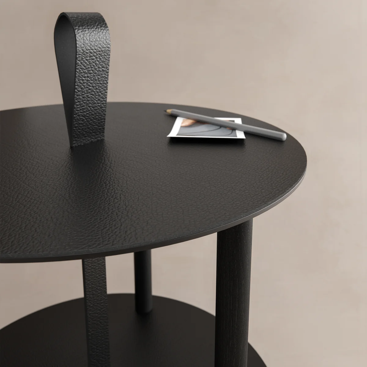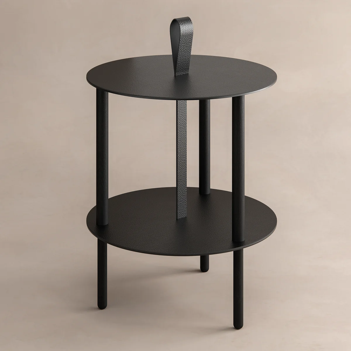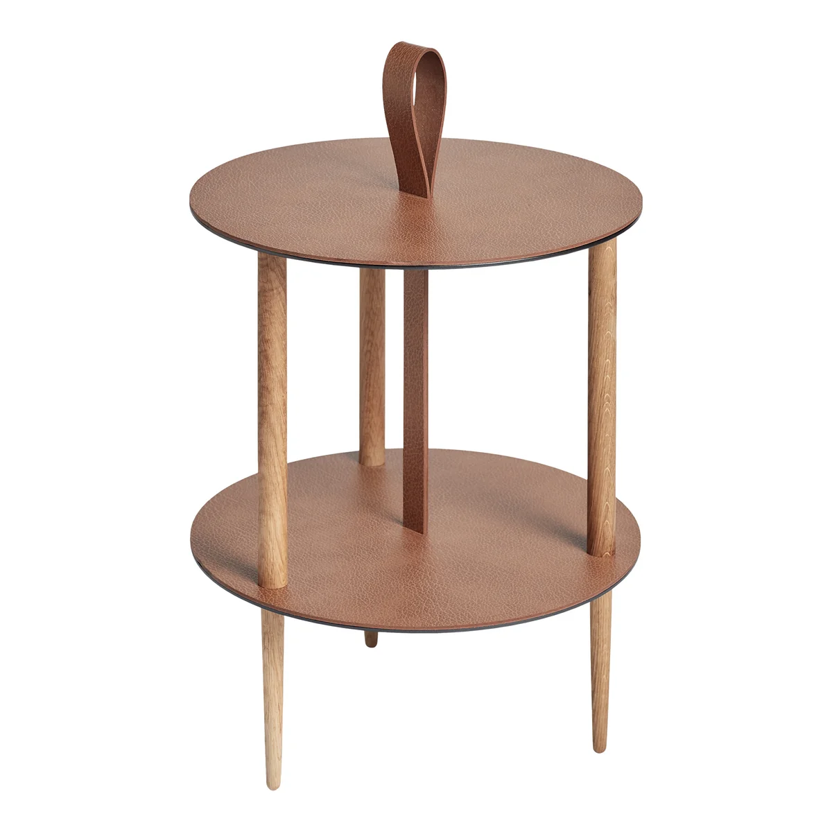 Der Beistelltisch besteht aus drei Stangen aus Eichenholz und zwei runden Ablageflächen mit einem Durchmesser von 38 cm aus Aluminium. Auf den Flächen finden Bücher, Dose, die Lesebrille, Gläser und vieles mehr einen stilvollen Platz. Die Flächen sind mit recyceltem Leder überzogen. Besonders praktisch auch die Schlaufe aus recyceltem Leder.