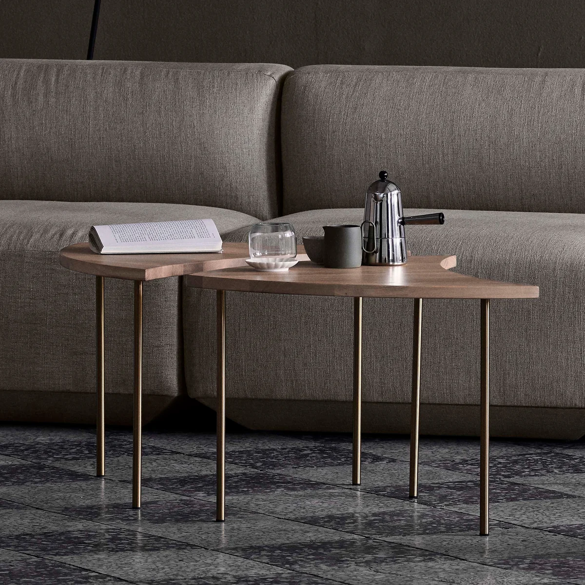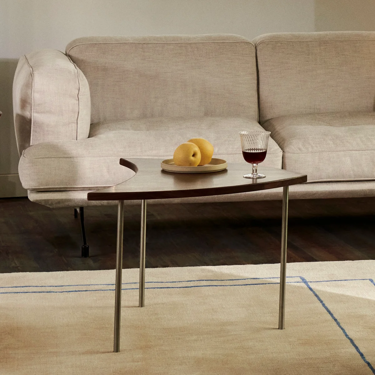 Der Tisch ist in Eiche oder Nussbaum erhältlich, seine Edelstahl- oder Messingbeine sind mit einer Politur versehen.