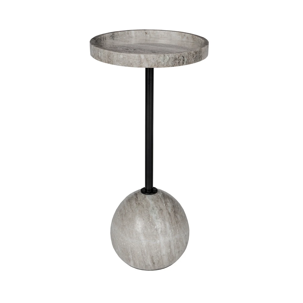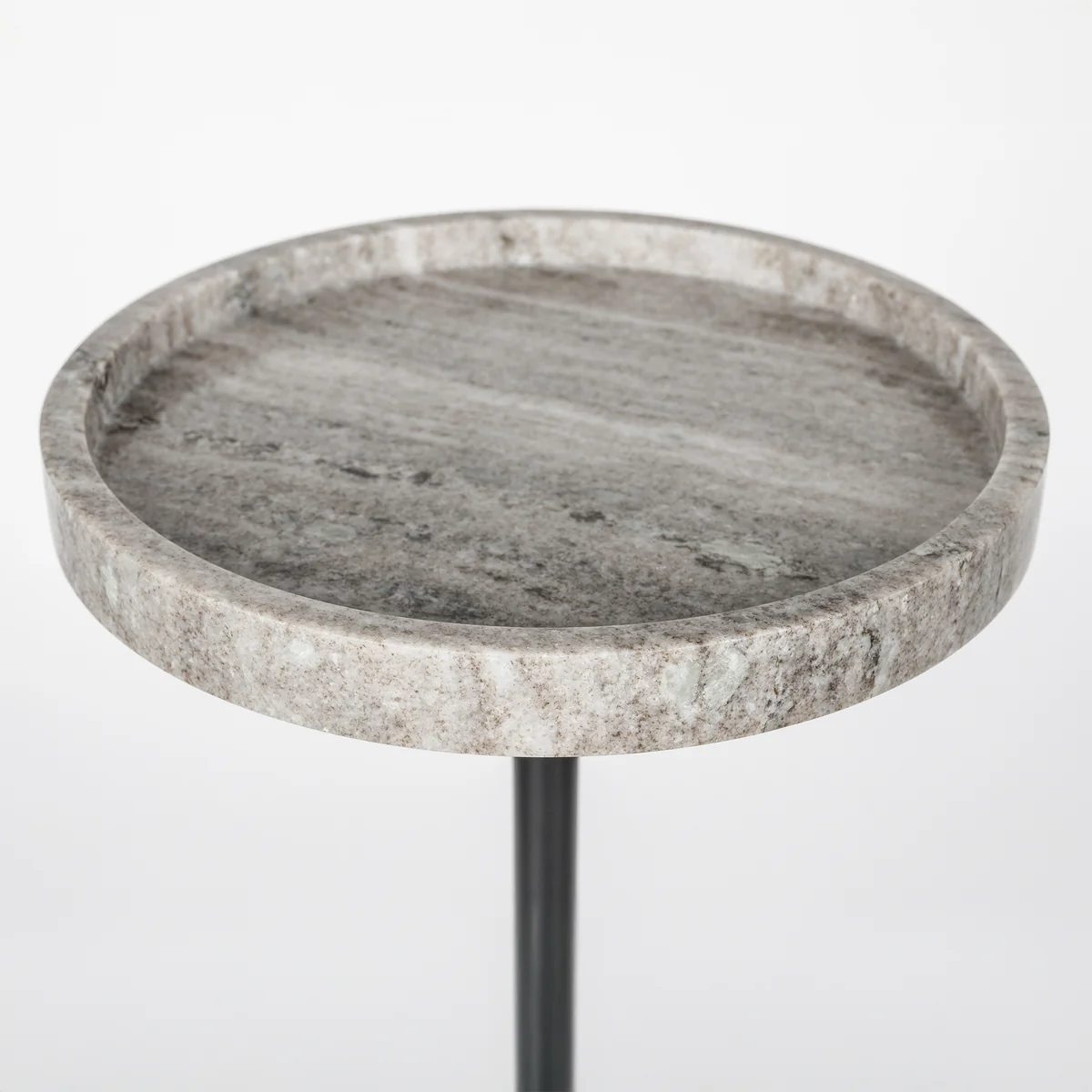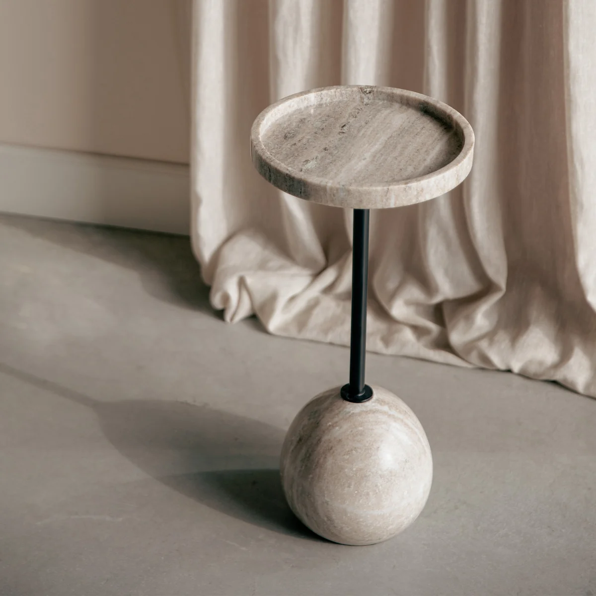 Ein erhöht umlaufender Rand auf der Marmorplatte sorgt nicht nur für ein optisches Detail, sondern bietet auch praktische Funktionalität, da er Gläser und Gegenstände an Ort und Stelle hält. Im Zentrum verbindet eine schwarz pulverbeschichtete Eisenstrebe die massive Platte mit dem runden Fuß – ein Kontrast, der Stabilität und gestalterische Klarheit vereint.