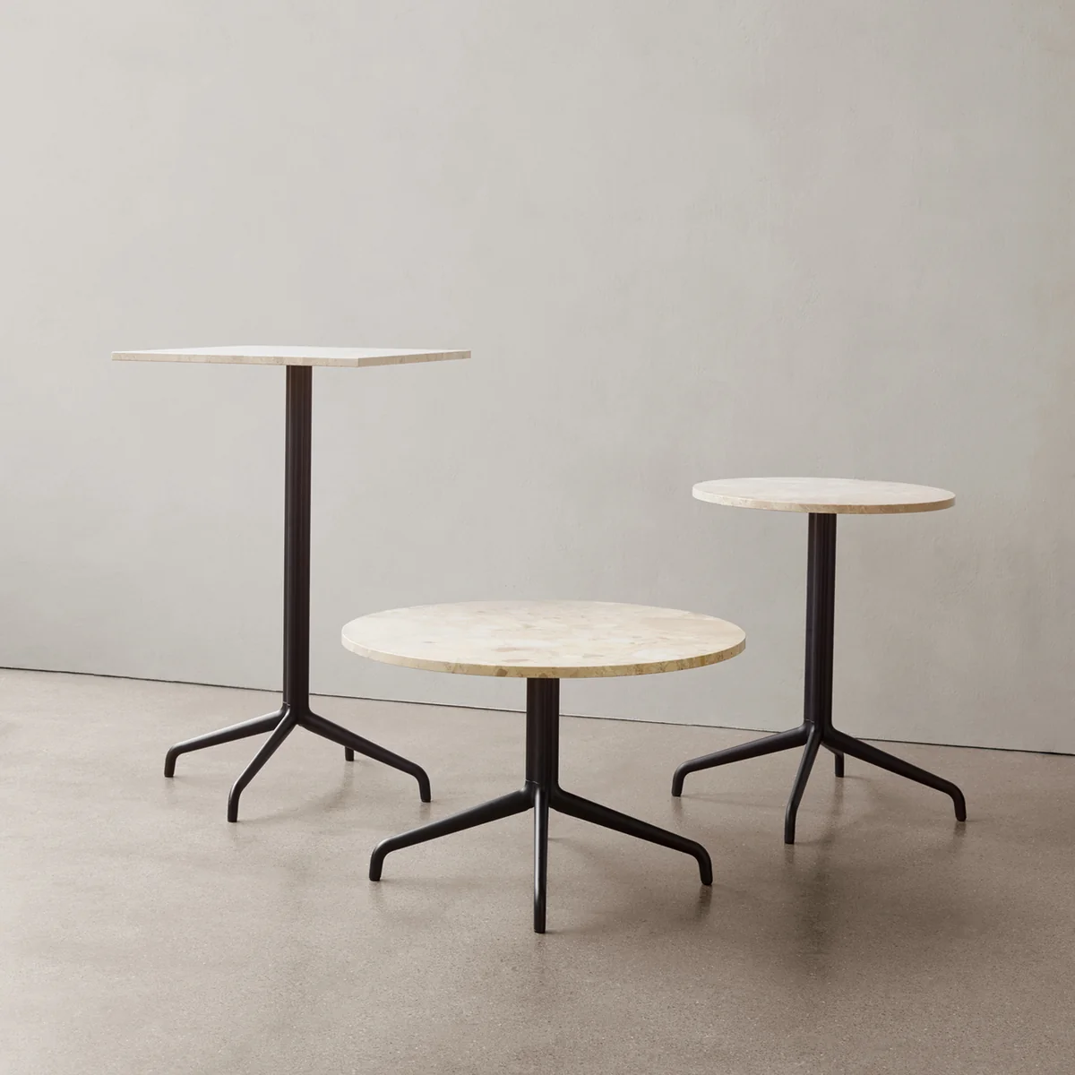 Die Tischplatte besteht aus einfachen geometrischen Formen und ist in einer runden sowie einer eckigen Variante erhältlich. Die Auswahl verschiedener Oberflächen kann bestens dem eigenen Geschmack angepasst werden. Als Basis dient ein Säulenelement aus pulverbeschichtetem Stahl mit rundem Standfuß. Es sorgt für Stabilität, zeichnet sich jedoch gleichzeitig durch seine schlanke Silhouette aus.