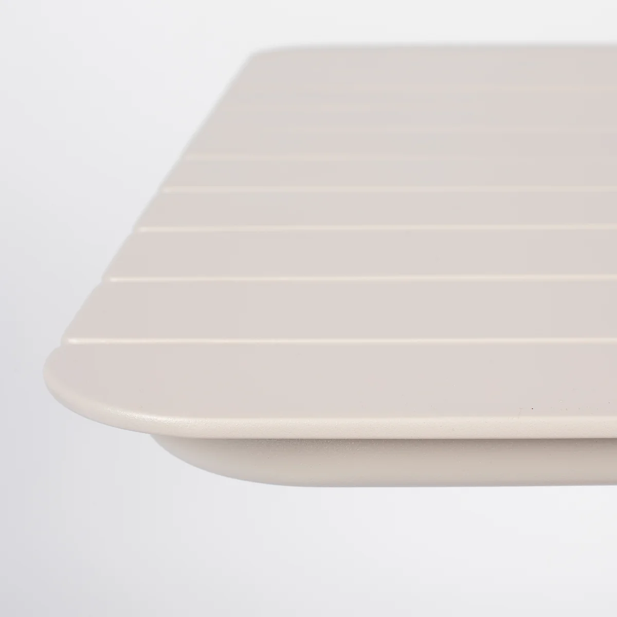 Die klaren Linien und das durchdachte Design stammen aus einer Kooperation zwischen dem niederländischen Label Zuiver und dem renommierten Studio APE. Dabei wurde auf jedes Detail geachtet: Die leicht geneigten Tischbeine sorgen für hohe Stabilität, während die feinen Aussparungen in der Tischplatte dafür sorgen, dass Regenwasser problemlos ablaufen kann.