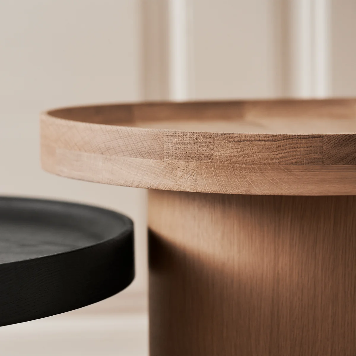 Das Untergestell besteht aus geformtem Furnier und beinhaltet zudem ein verstecktes Ablagefach. Die Platte selbst kann auch als Tablett dienen.