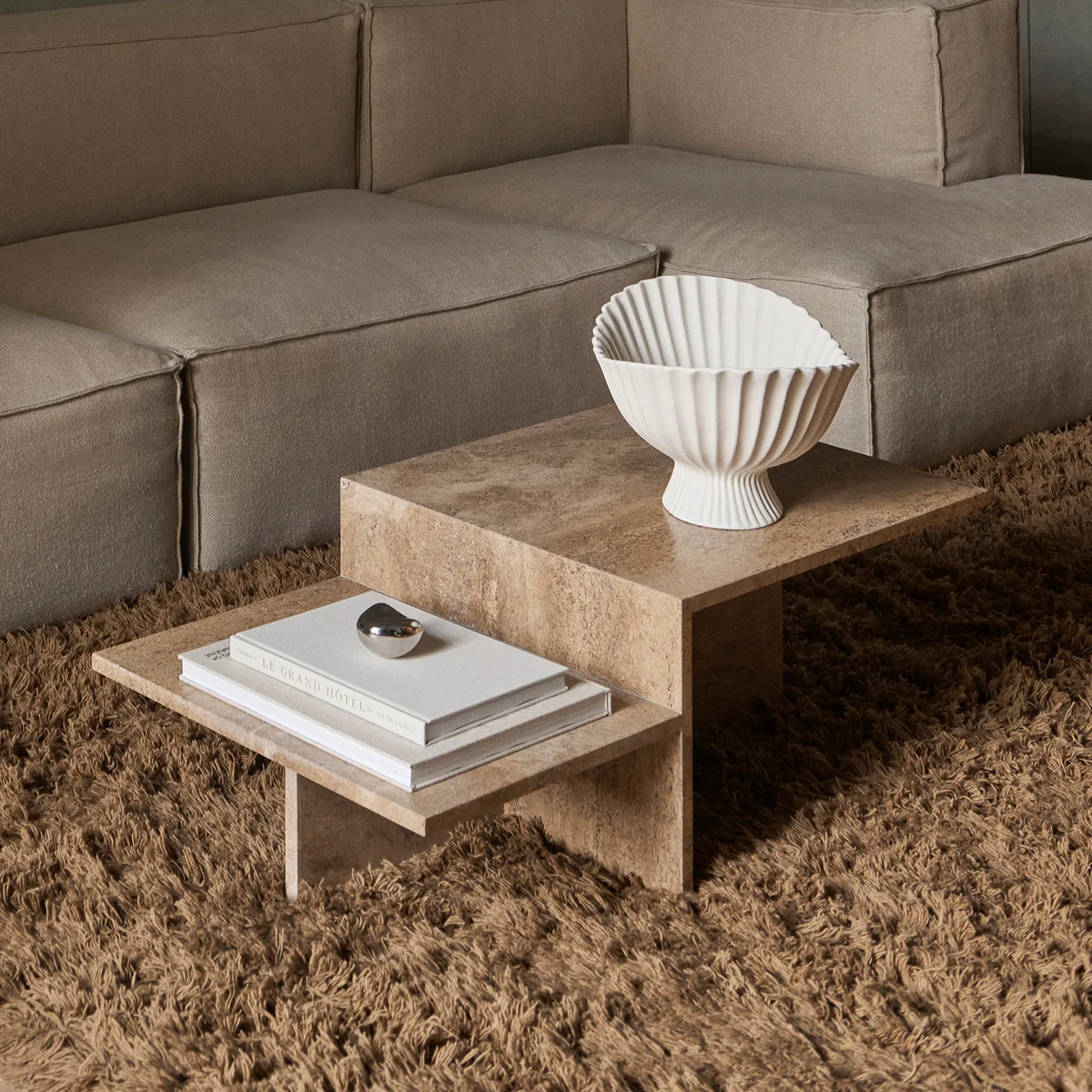 Der Distinct Couchtisch von Ferm Living ist ursprünglich vom japanischen Minimalismus inspiriert und erforscht komplexe Strukturen, die auf einem einzigen Element basieren. Hergestellt wird der außergewöhnliche Tisch in geometrischen Formen aus Travertin. Die natürlichen und vielfältigen Eigenschaften des sandfarbenen Kalksteins sorgen für eine besondere Haptik, die den architektonischen Charakter des Möbelstücks unterstreichen.